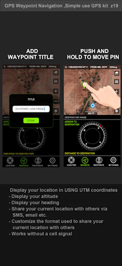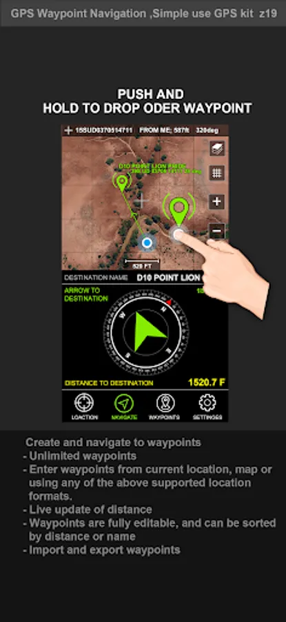 Users can store multiple waypoints and navigate to them. The user can also save their current position as a waypoint to navigate back to later.