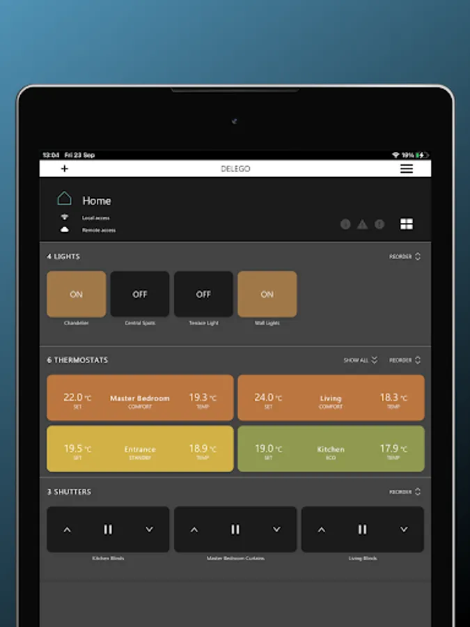 You can navigate across areas (for example: living room, bedroom, kitchen) or across services (for example: controls of all the lights that you have in your home). The App allws you to access immediately to 4 basic functions (lighting, thermal regulation, shutter/blind and scenes), while with the upgrade you can use 4 mayor functions: energy monitoring, ip video surveillance, audio/video systems control and anti-intrusion monitoring.