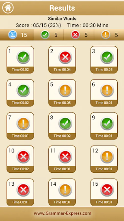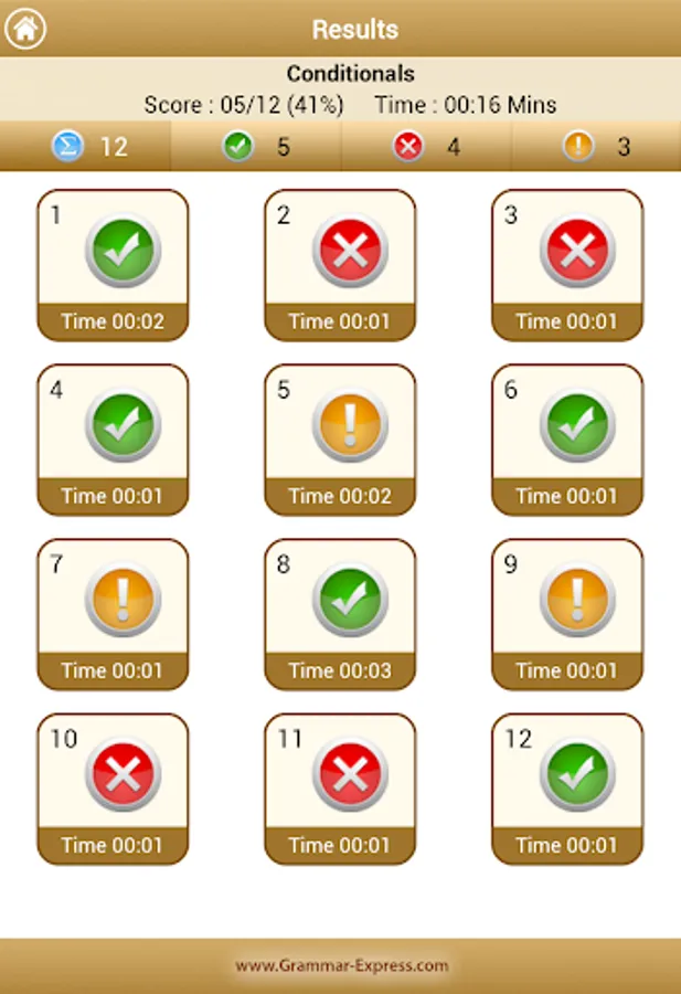 A summary of the practice test is presented at the end of each test. It shows you the time you took, the score, which questions you answered correctly and where you were wrong.