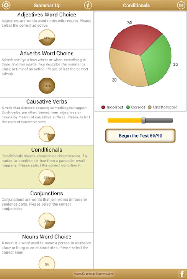 You can study the grammar rules by topic. All questions are sorted by topic. It also tells you the areas that each topic covers.