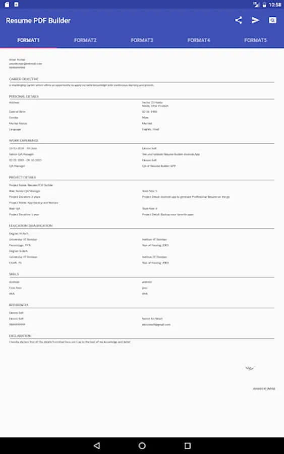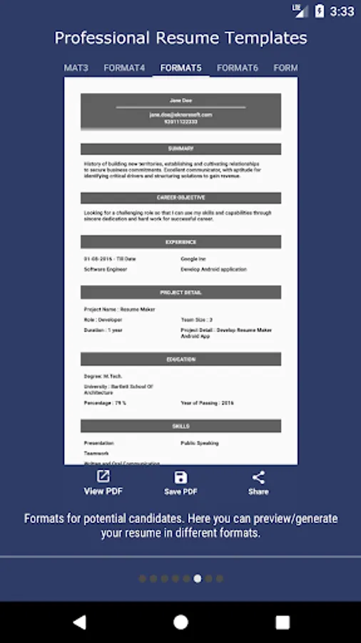 Resume Maker app provides you ready made resume templates or samples. To create resume you do not need to worry about what format, what information to put etc, just enter the information and forget about the formatting, we will take care of formatting for you. This Resume editor allows you to choose resume from among 15 formats. All the formats are completely free.