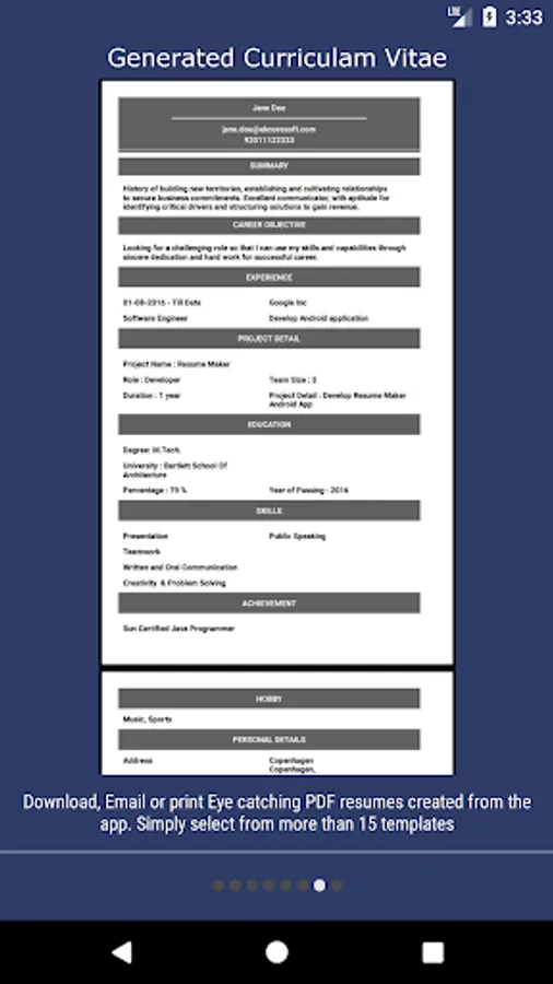 Resume or CV is first impression during job hunting. Resume PDF Maker app will help you to create, make, edit, share professional format resumes in PDF format quickly. Professional looking resume is a must have when you apply for any job, going for an interview, job hunting, job search, applying for jobs on job site etc.