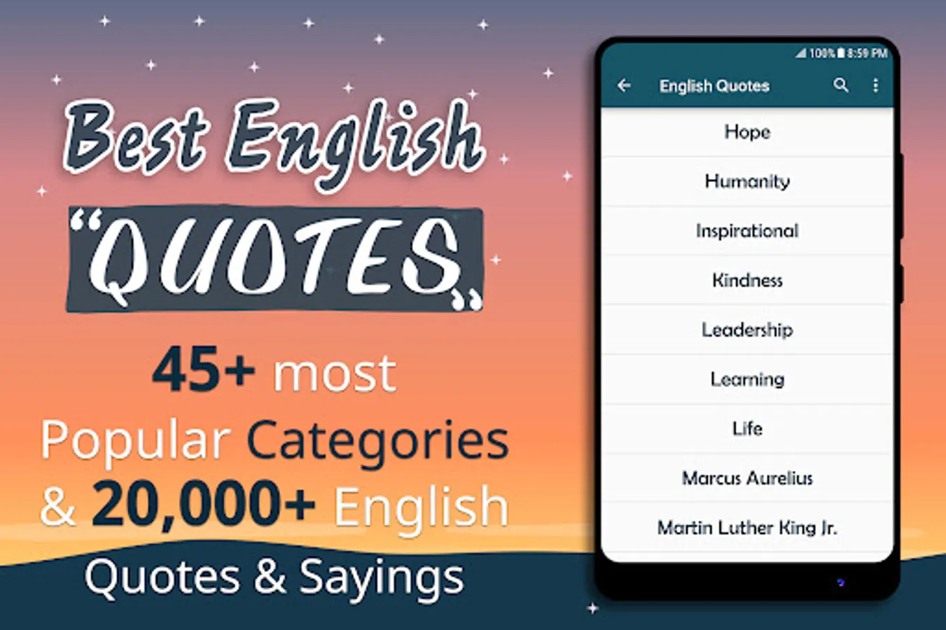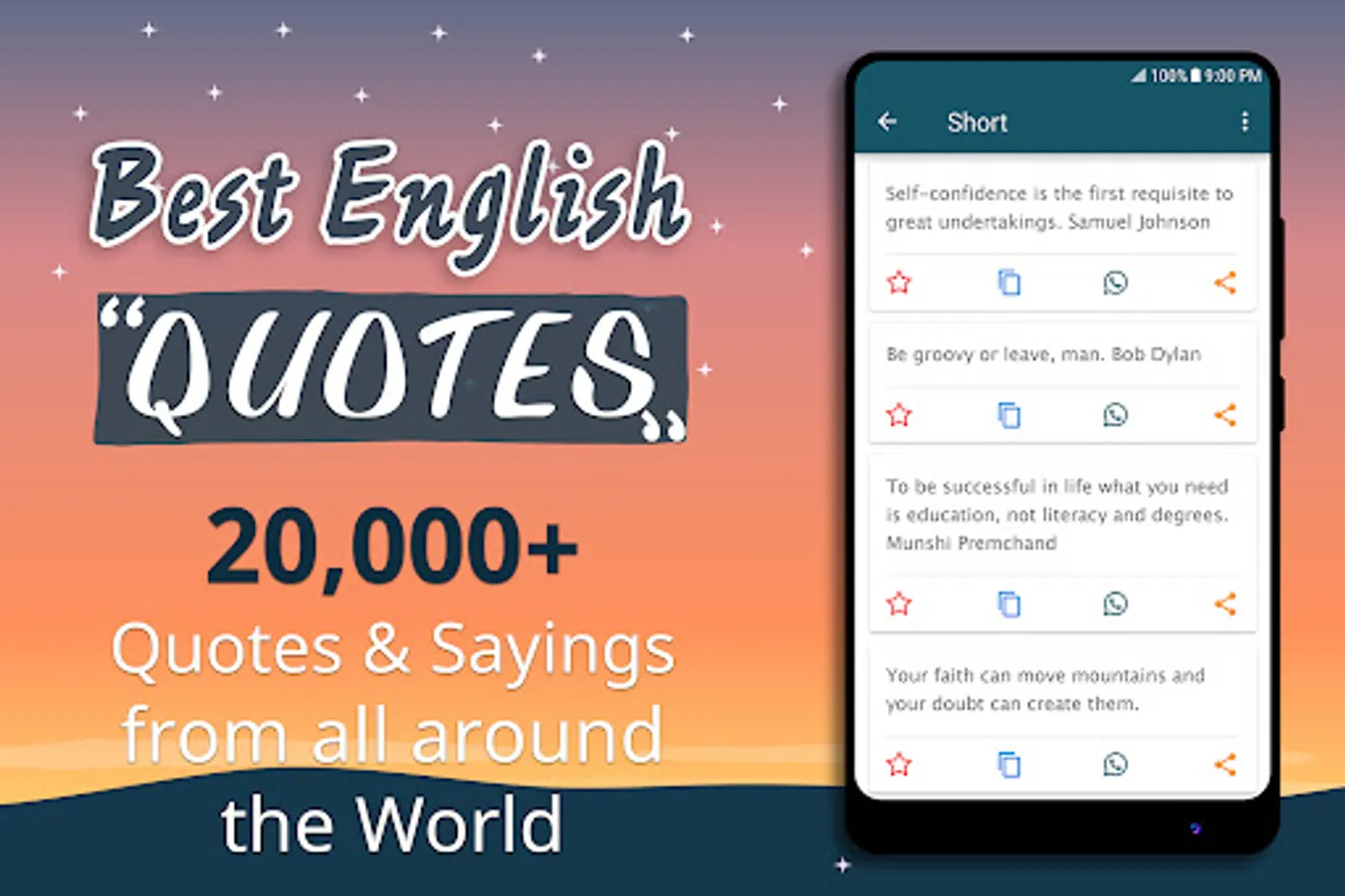 Best English Quotes - Quotes for Status Collection is a free and offline app for best and unique collection of Quotes and Sayings from best authors, writers and celebrities of the world. Best English Quotes contains the biggest collection of amazing quotes from every aspect of the life. Best English Quotes contains 20,000+ best daily quotes and sayings under 45+ categories and authors.