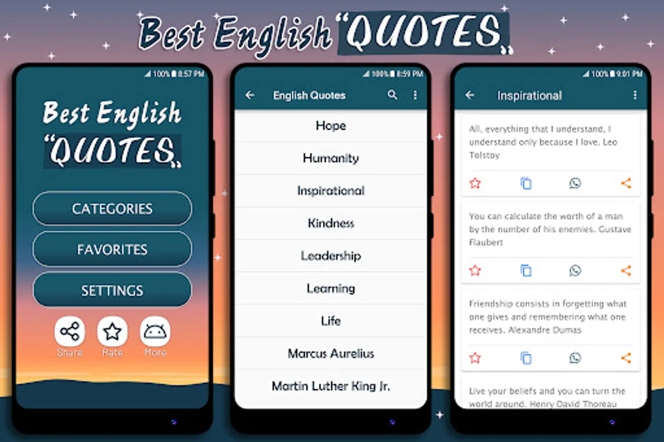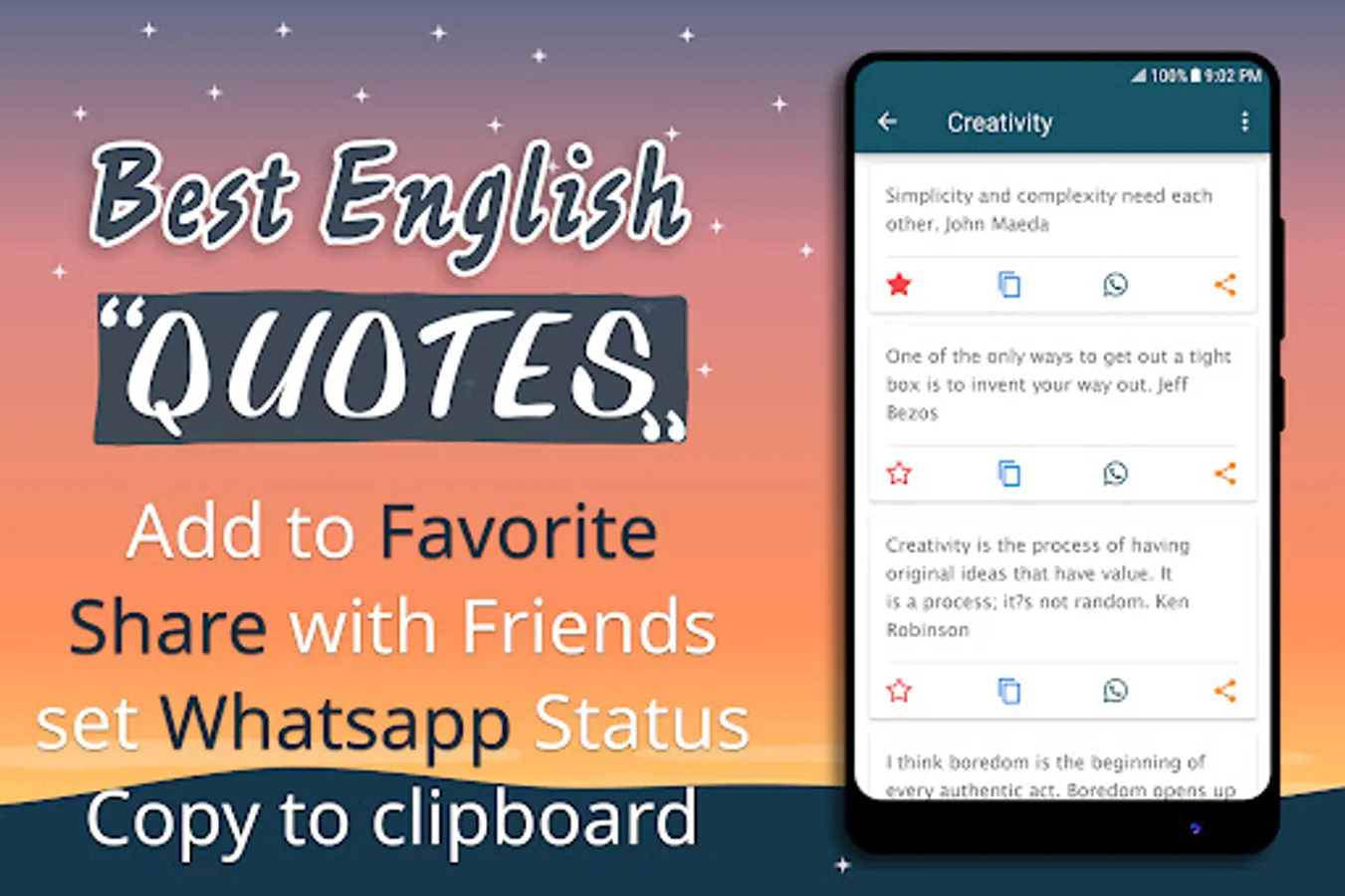 Keep this Best English Quotes - Quotes for Status Collection app always with you, where ever you go. Check best daily quotes during your every day routine and keep inspired.
