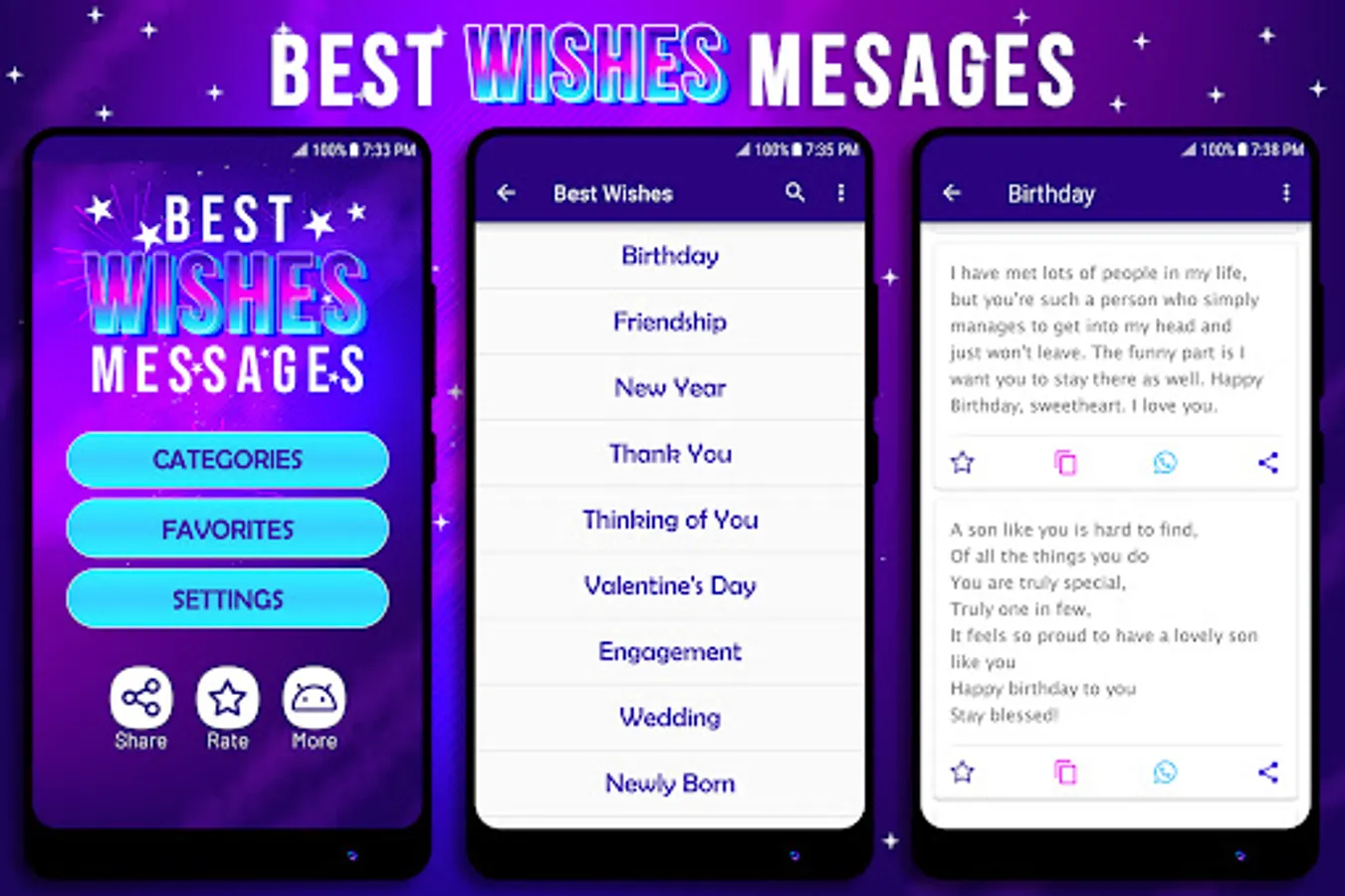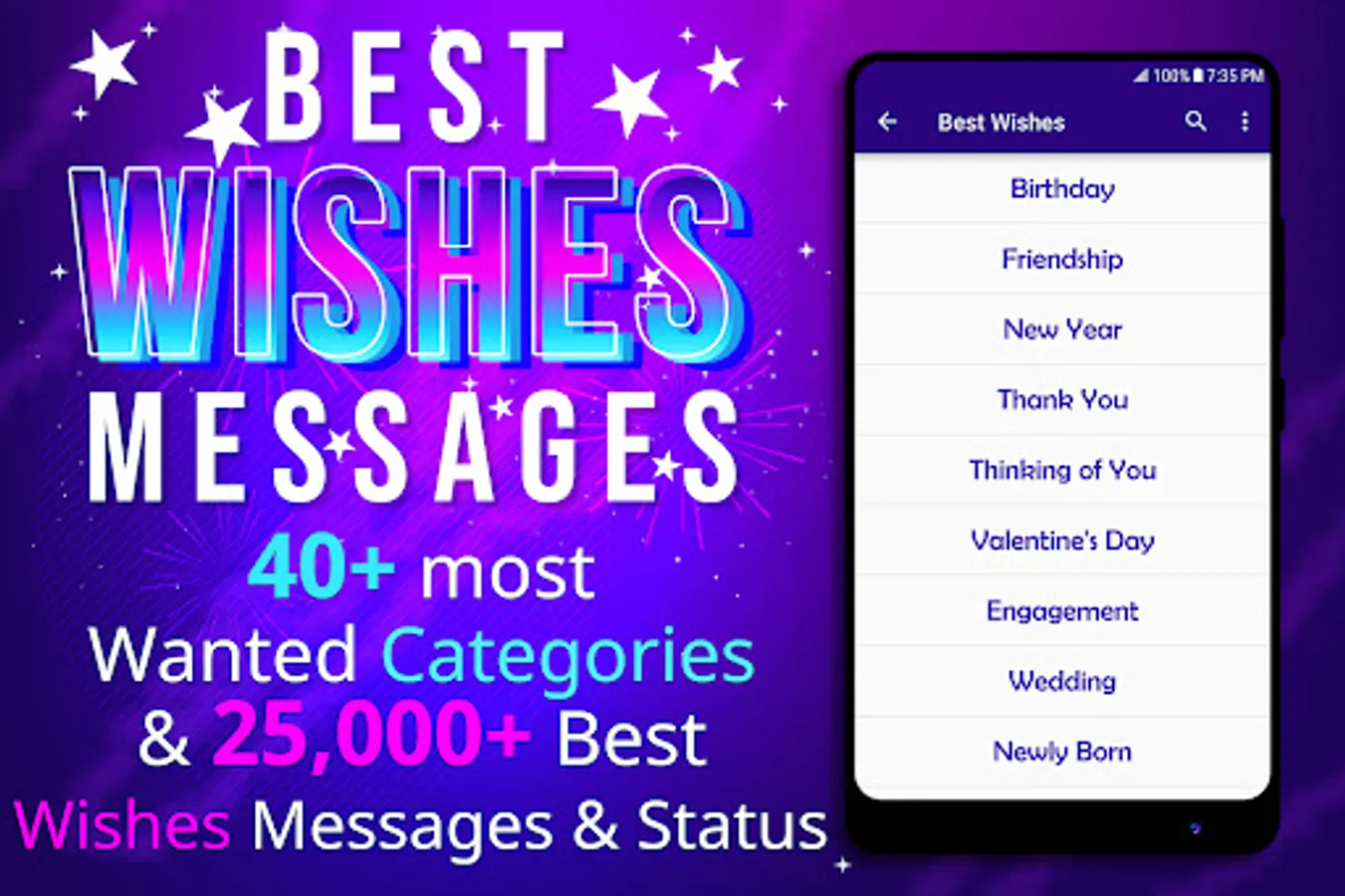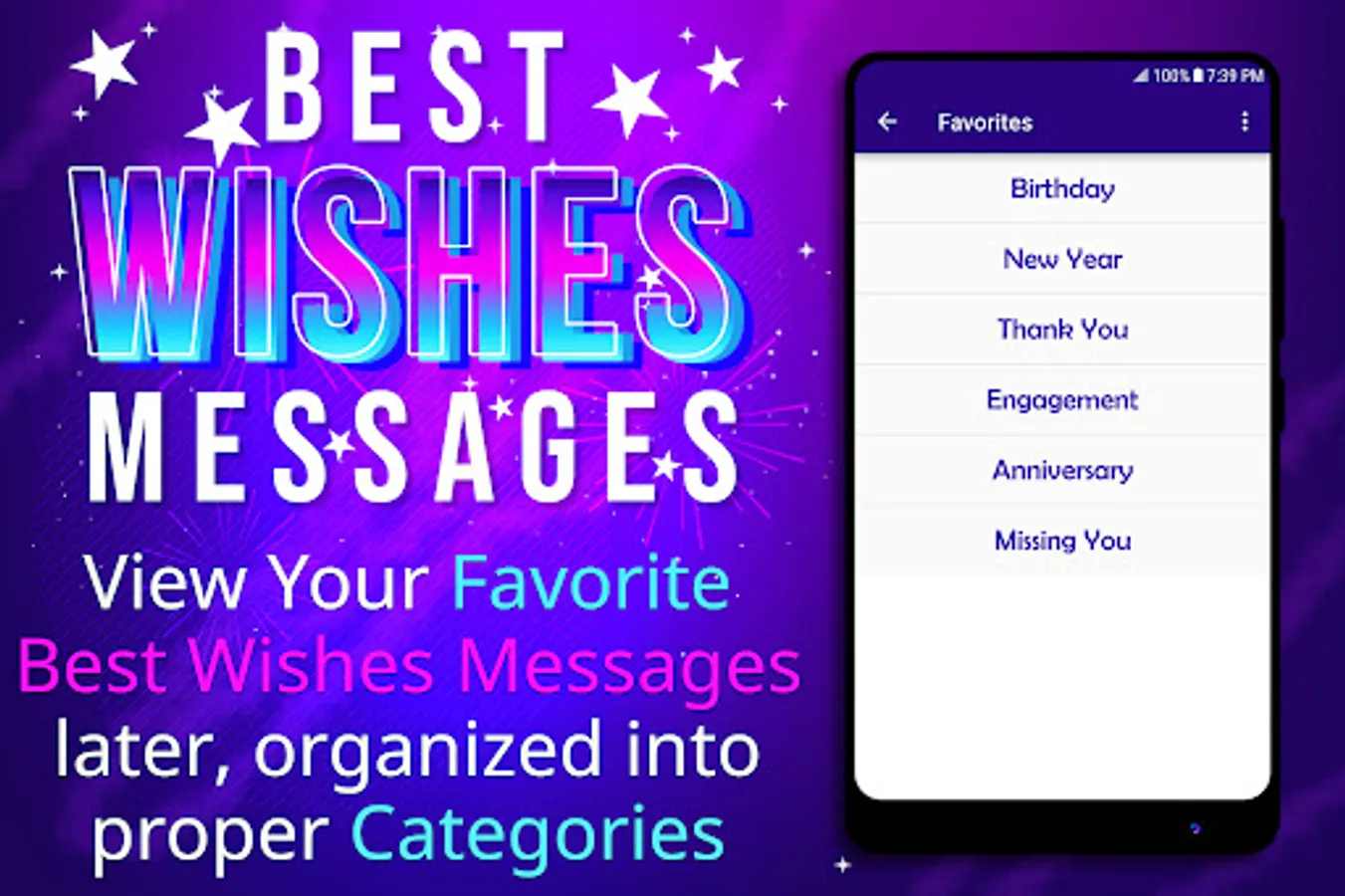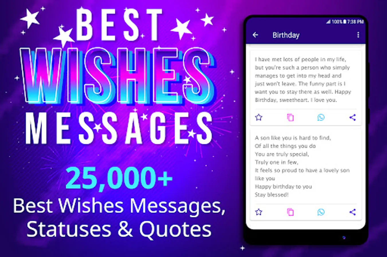 All Wishes Messages is a free and offline app for amazing and unique collection of Best Wishes, Love Messages, Birthday Wishes, Congratulation Messages, Status, Quotes and Sayings. Best Wishes Messages contains the biggest collection of amazing valentine's day messages, friendship messages, anniversary messages from all around the world. All Wishes Messages Collection contains 25,000+ best daily wishes messages, status,quotes and sayings under 40+ categories.