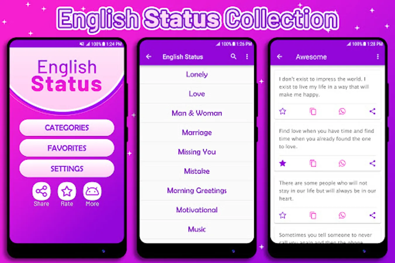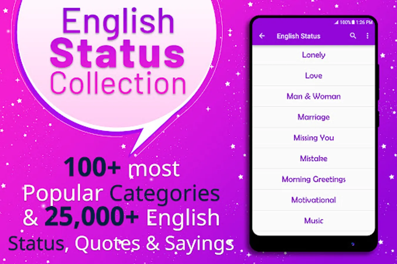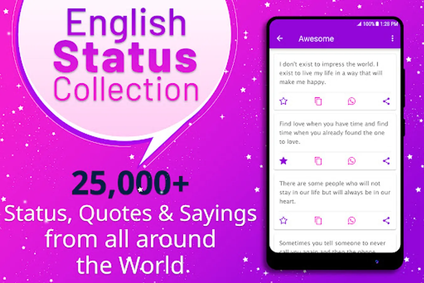 English Status Collection - Best Status & Quotes is a free and offline app for best and unique collection of Status, Quotes and Sayings. English Status Collection contains the biggest collection of amazing status messages from every aspect of the life. English Status Collection contains 25,000+ best daily status,quotes and sayings under 100+ categories.