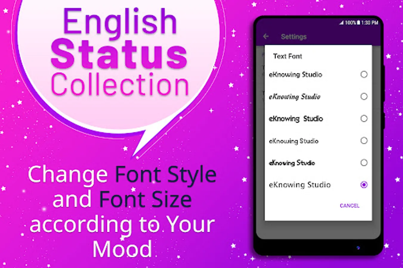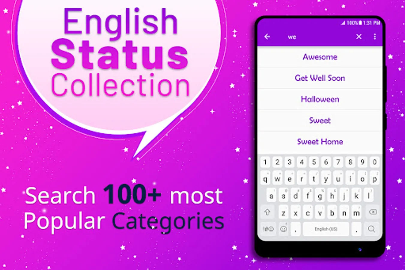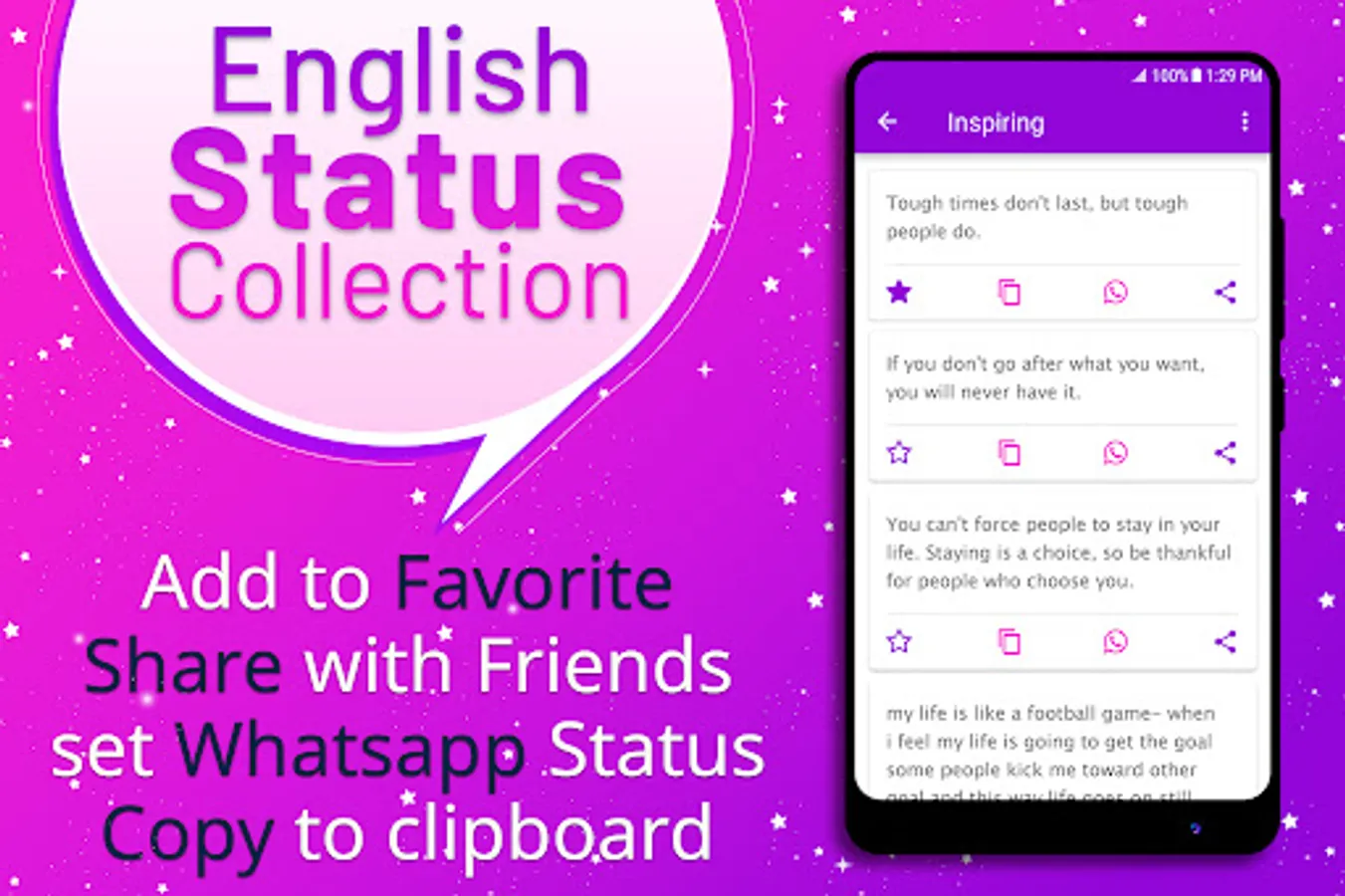 English Status Collection - Best Status & Quotes is a free and offline app for best and unique collection of Status, Quotes and Sayings. English Status Collection contains the biggest collection of amazing status messages from every aspect of the life. English Status Collection contains 25,000+ best daily status,quotes and sayings under 100+ categories.