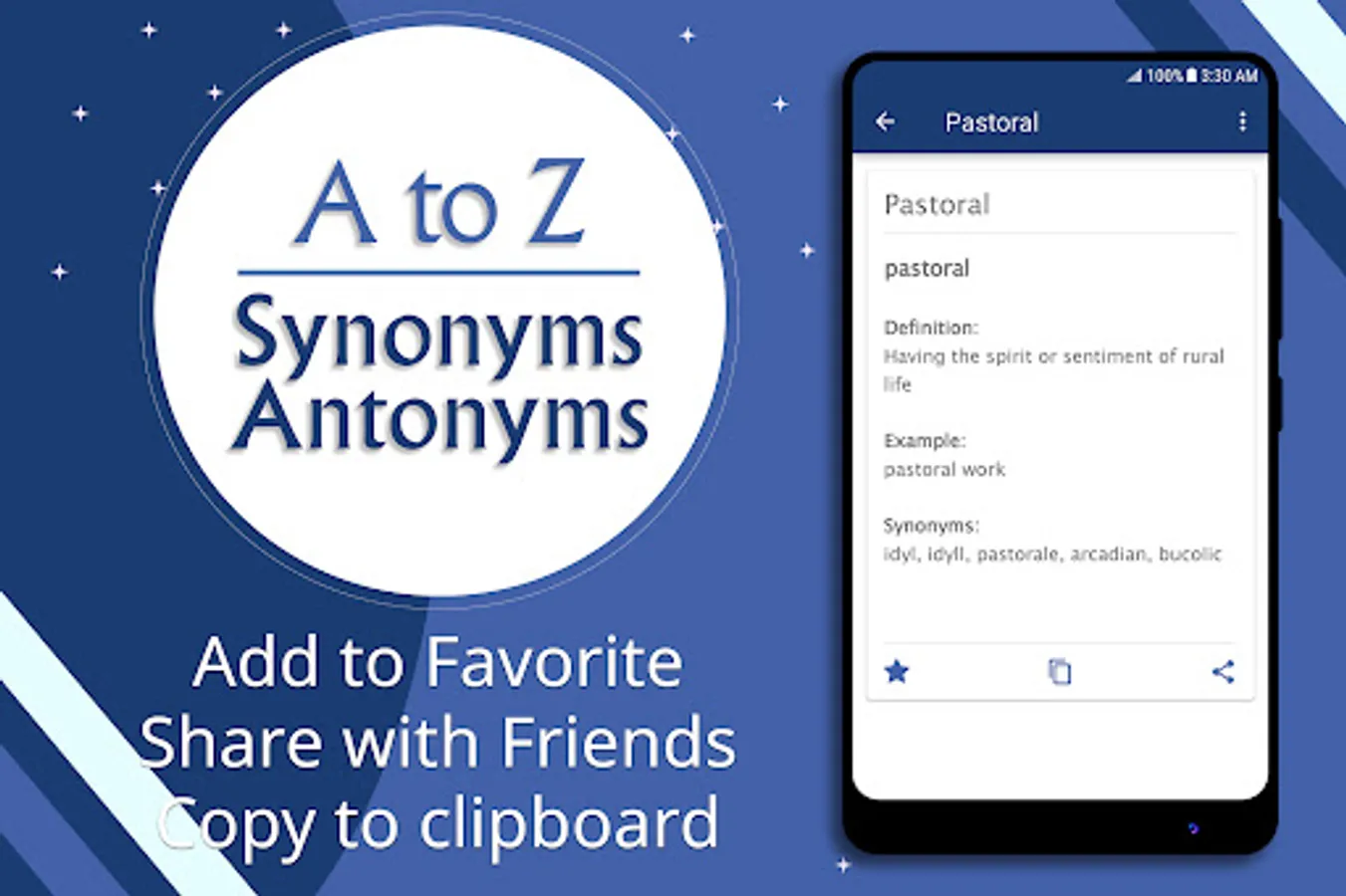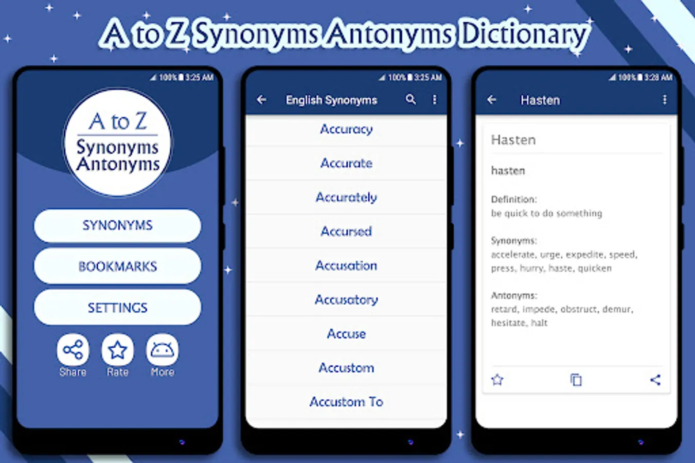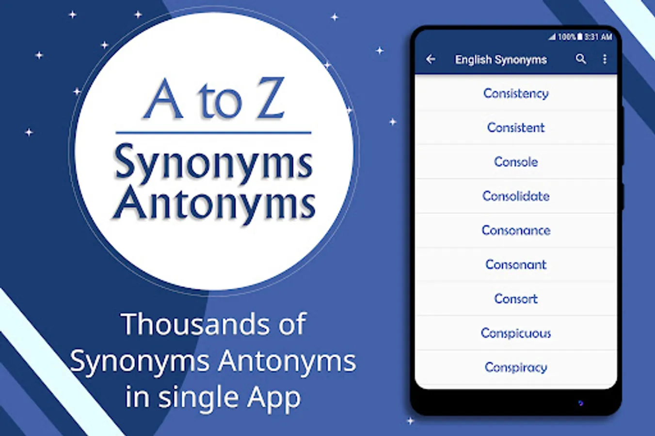 Synonyms Antonyms - A to Z Synonyms Dictionary is a full english dictionary app that contains complete list of synonyms words and synonyms definitions. Synonyms Antonyms is also a perfect daily using app for everyone.