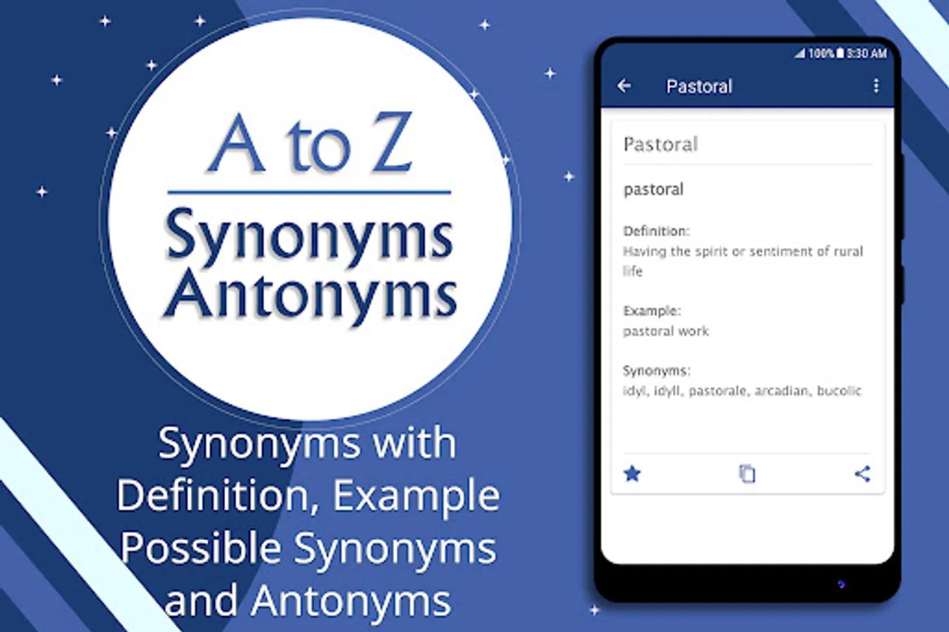 Synonyms Antonyms Dictionary is a free and offline app for best and unique collection of synonyms, synonyms definition, synonyms examples and possible synonyms antonyms. Synonyms Antonyms Dictionary contains the biggest collection of synonyms antonyms terms and definitions. Synonyms Antonyms - A to Z Synonyms Dictionary contains 12,000+ synonyms terms, its definition, examples and antonyms.