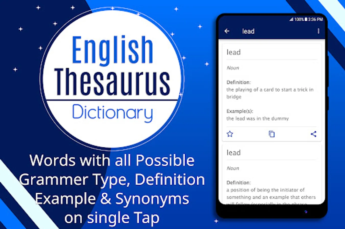 English Thesaurus Dictionary is a free and offline app with biggest collection of 175,000+ words with grammer type, definition, examples and synonyms from Oxford, Webster, Chamber and Mariam Thesaurus. English Thesaurus Dictionary provides largest english words database with clear, precise, multiple definitions of words with examples and all possible synonyms.