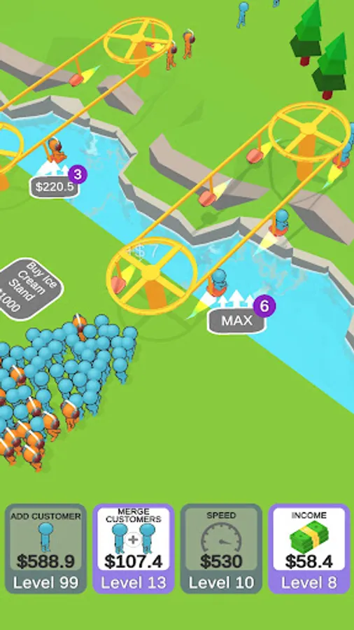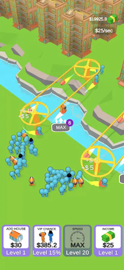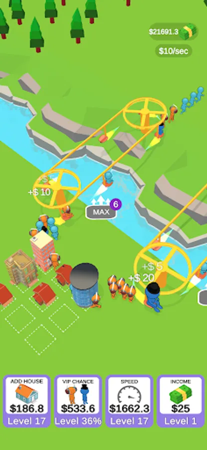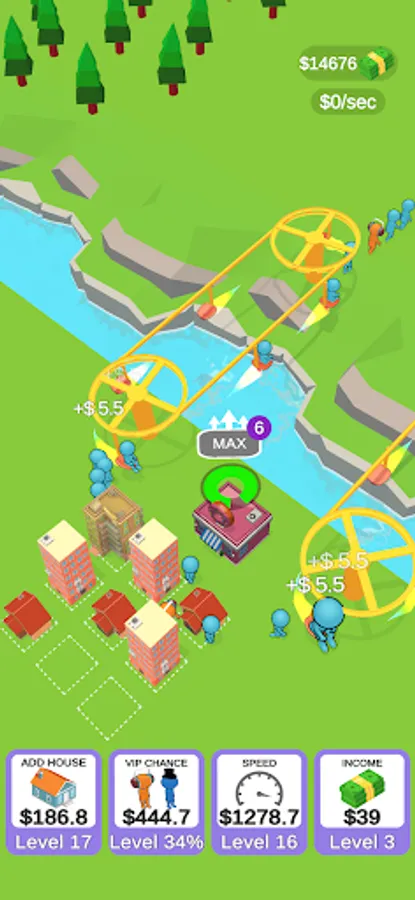 Build ropeway platforms to transport people, buy and merge houses to get more customers, purchase more seats, invest in businesses that grant you passive income. Advance through new & different levels. Many things to do in this satisfying idle merge game!