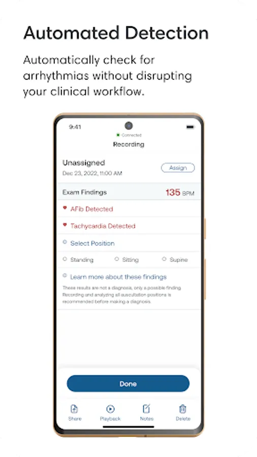 When connected to a compatible digital stethoscope, the Eko App automatically checks for arrhythmias during auscultation and rhythm assessments when recording analysis is enabled.