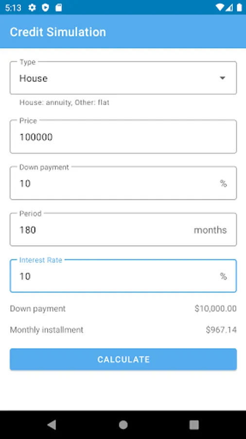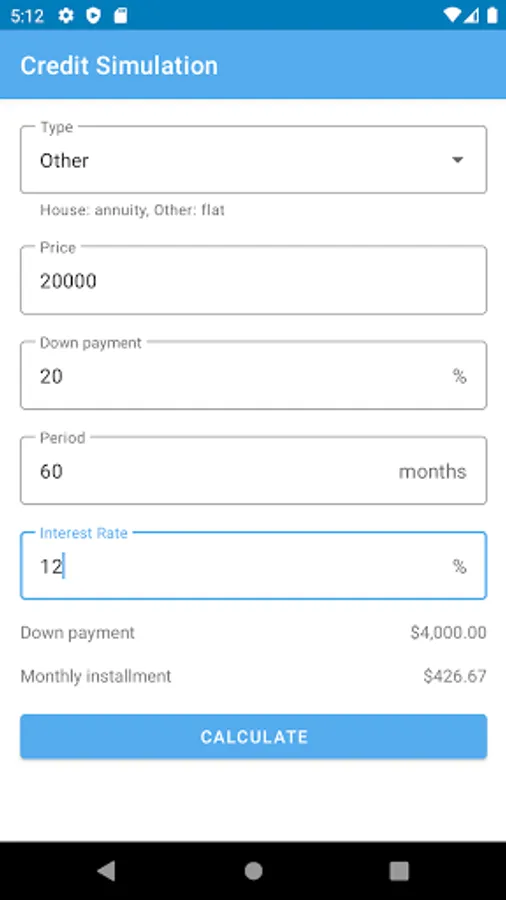 Credit Simulation automatically calculate down payment based on down payment percent input. Credit Simulation support from short term 6 months gadget installments to long term 15 years house installments. Credit Simulation can calculate any given interest rate from finance company.
