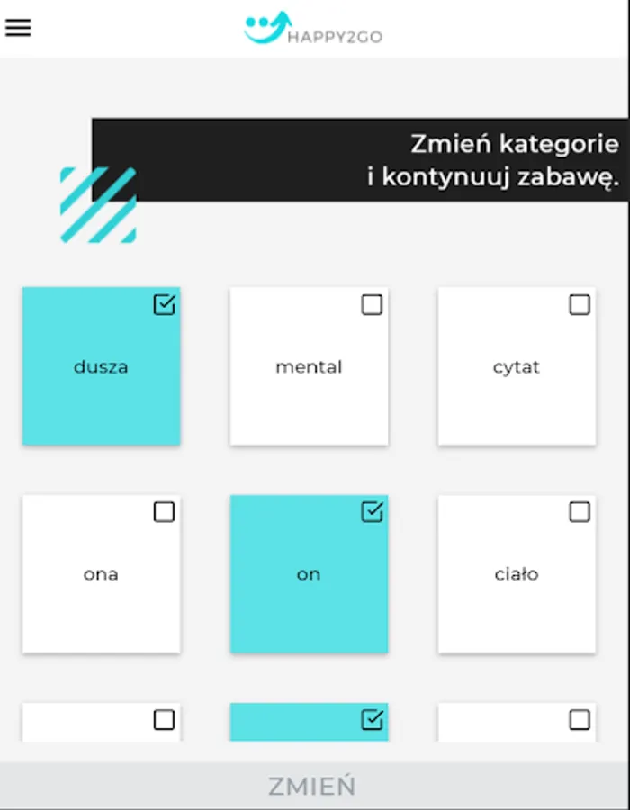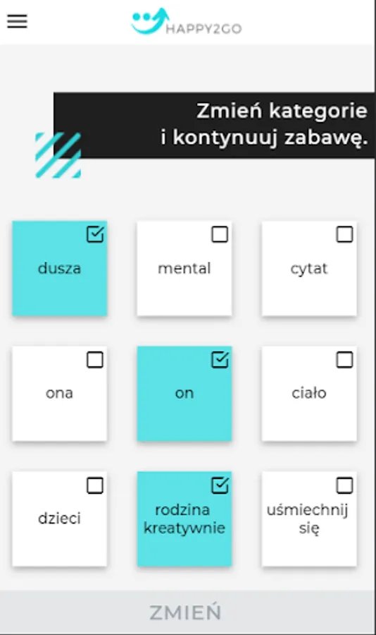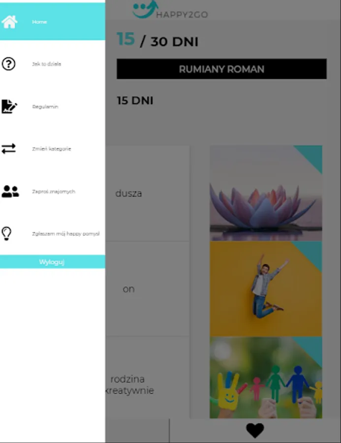 - after logging in, the user has various categories available that are important for happiness - currently there are 9 categories that will be expanded in new versions. Description of the category: