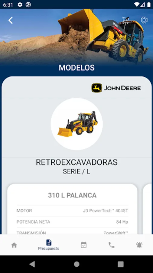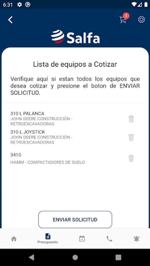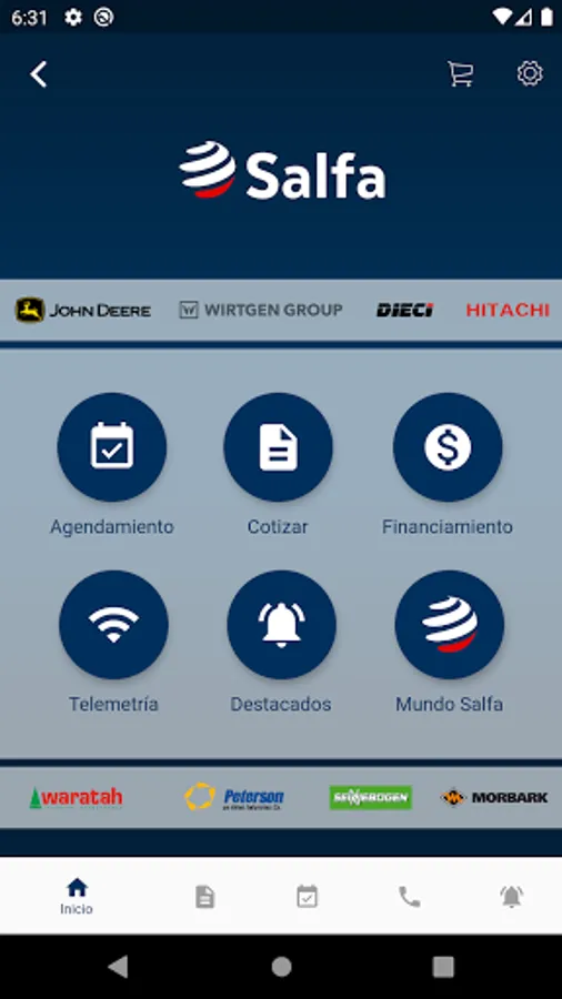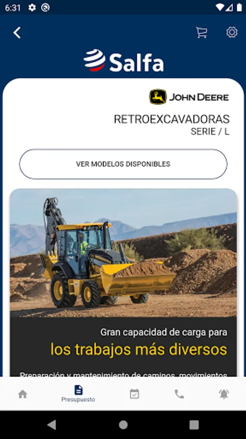 Welcome to the Salfa Maquinaria APP, through this APP you will be able to quote equipment of your preference with a pleasant shopping cart that will guide you through the entire equipment selection process and send quote requests.