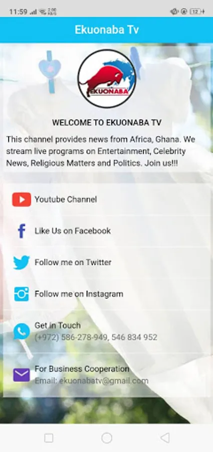 This is the Official App for the Ekuonaba Tv. We broadcast live on all Trending Issues in Ghana and beyond. You can find us on all the Social Media Platforms. The host Ekuonaba Boateng wishes to encourage you all the join the Ekuonaba Tv Family.
