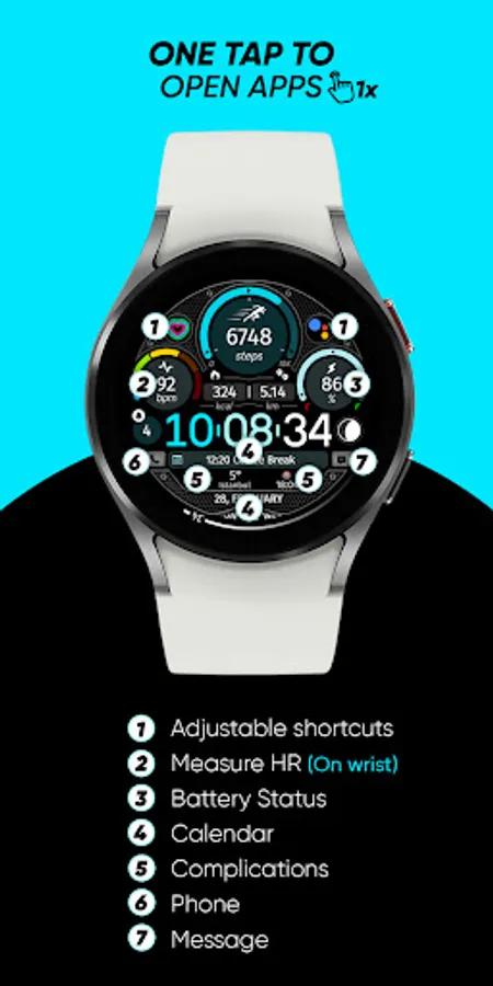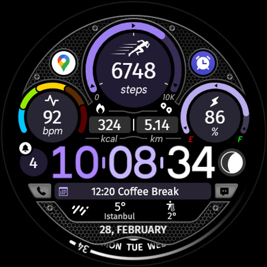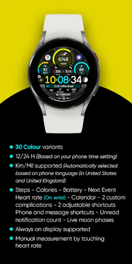 β π Steps - Calories - Battery - Next Event - Heart rate (On wrist) - Calendar - 2 custom complications - 2 adjustable shortcuts - Phone and message shortcuts - Unread notification count - Live moon phases