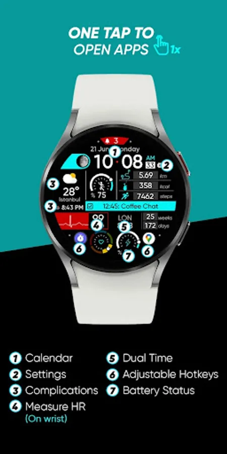 ● Steps - Distance - Calories - Battery - Heart rate (On wrist) - 2 custom complications - Dual time - Days in year - Calendar - 3 shortcuts - Unread notification count
