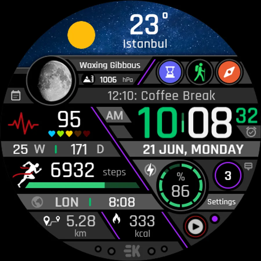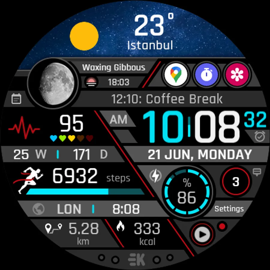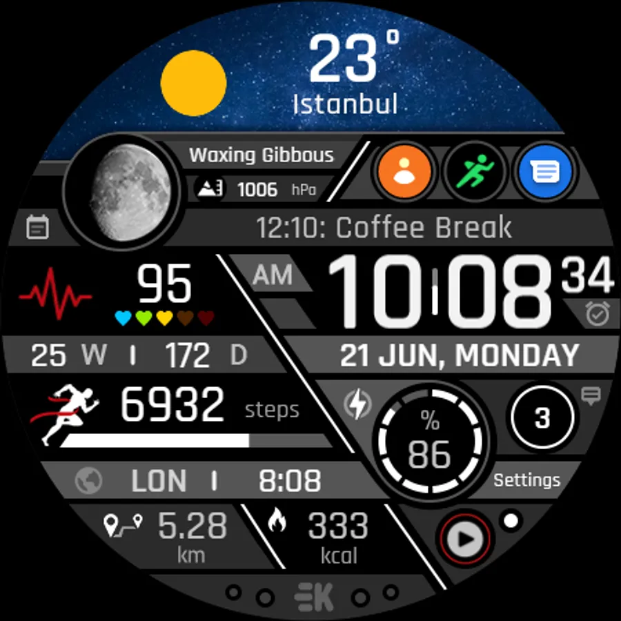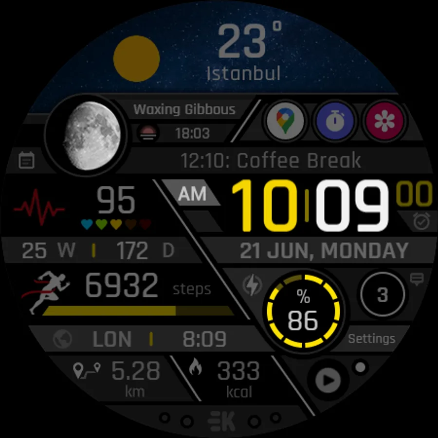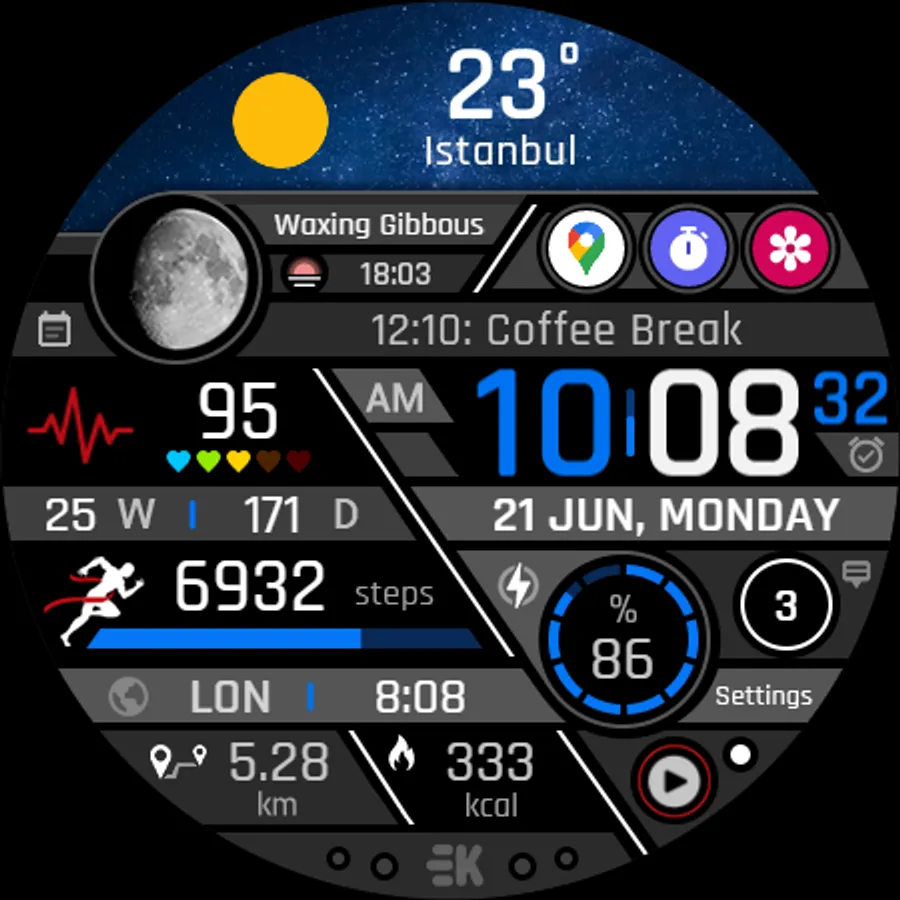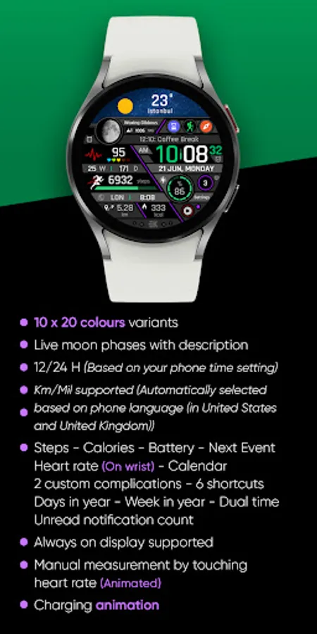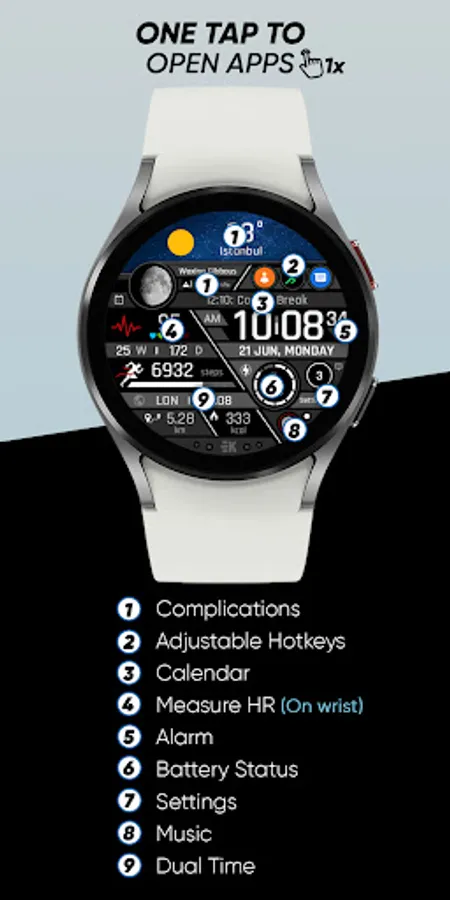● Steps - Calories - Battery - Next Event - Heart rate (On wrist) - Calendar - 2 custom complications - 6 shortcuts - Days in year - Week in year - Dual time - Unread notification count