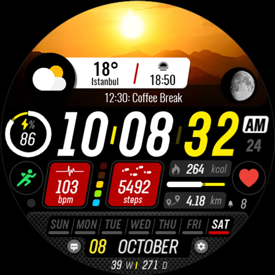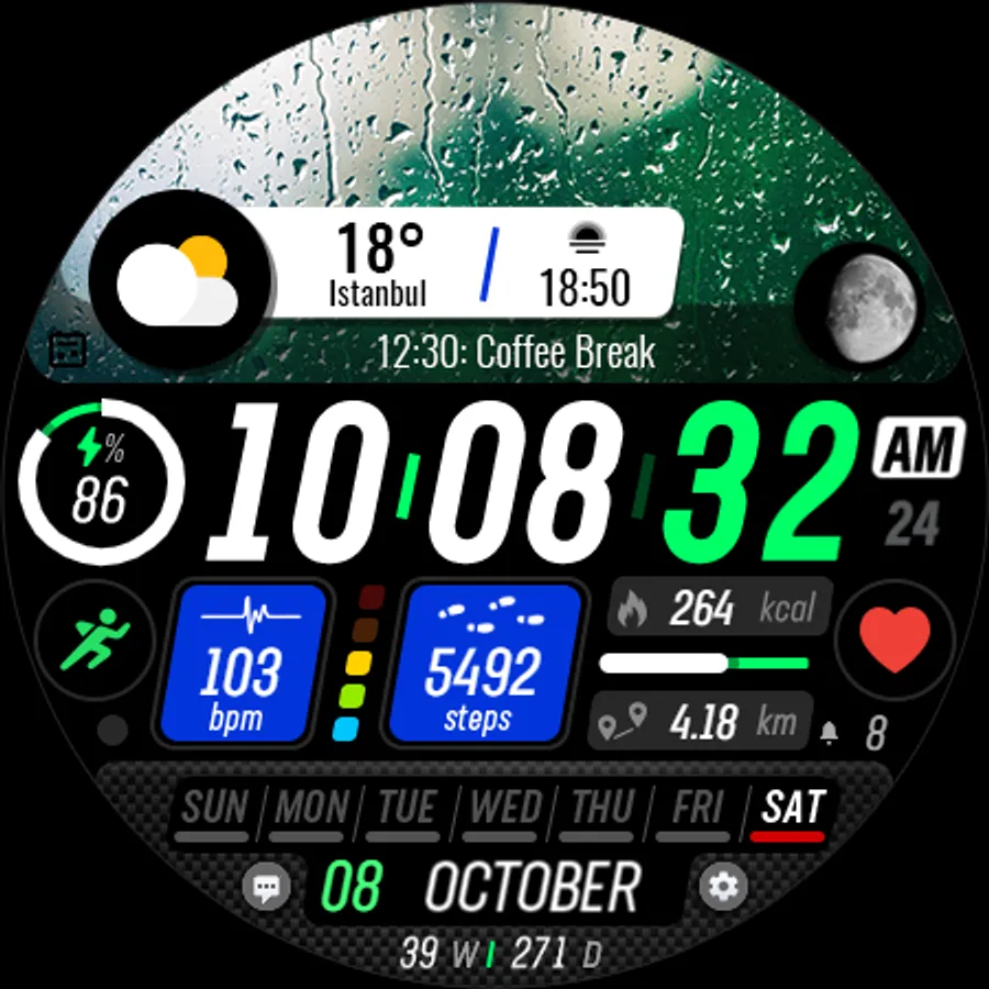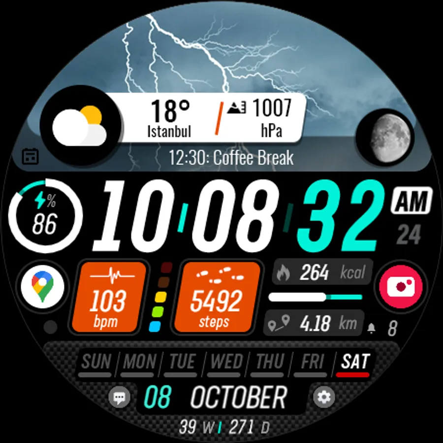 β π Steps - Calories - Battery - Next Event - Heart rate (On wrist) - Calendar - 2 custom complications - 4 shortcuts - Days in year - Week in year - Unread notification count
