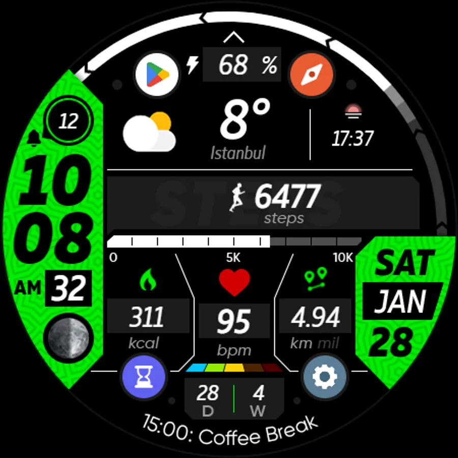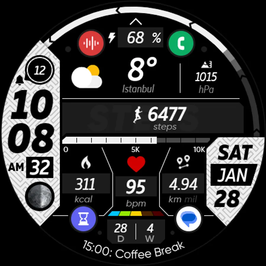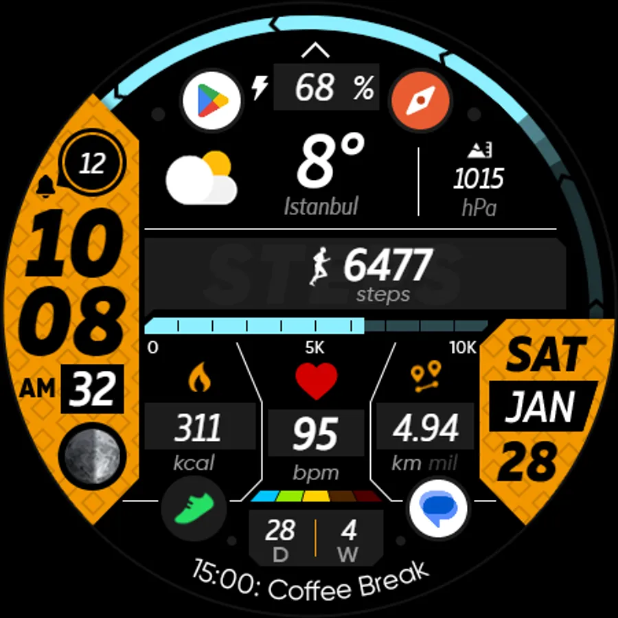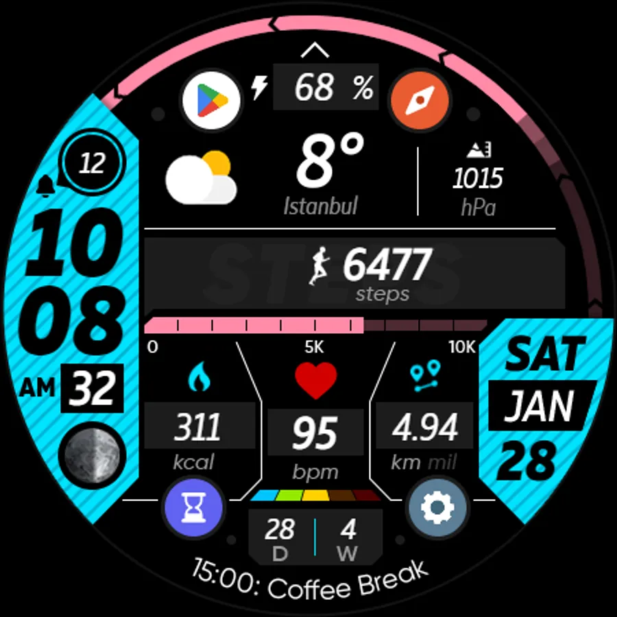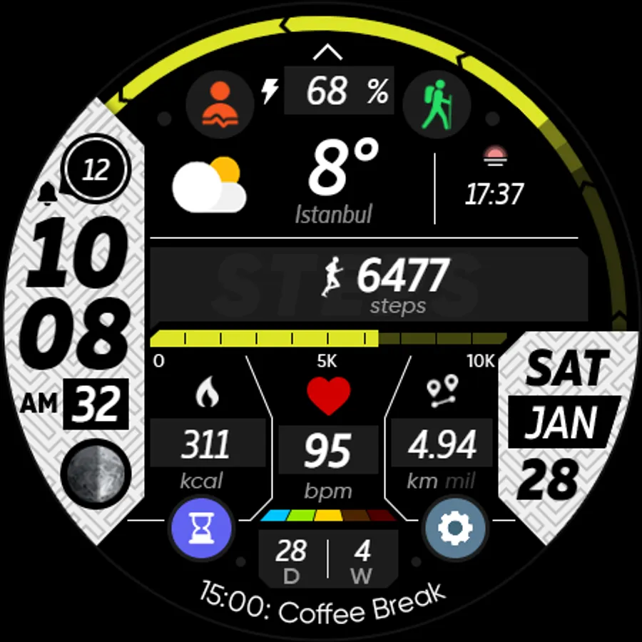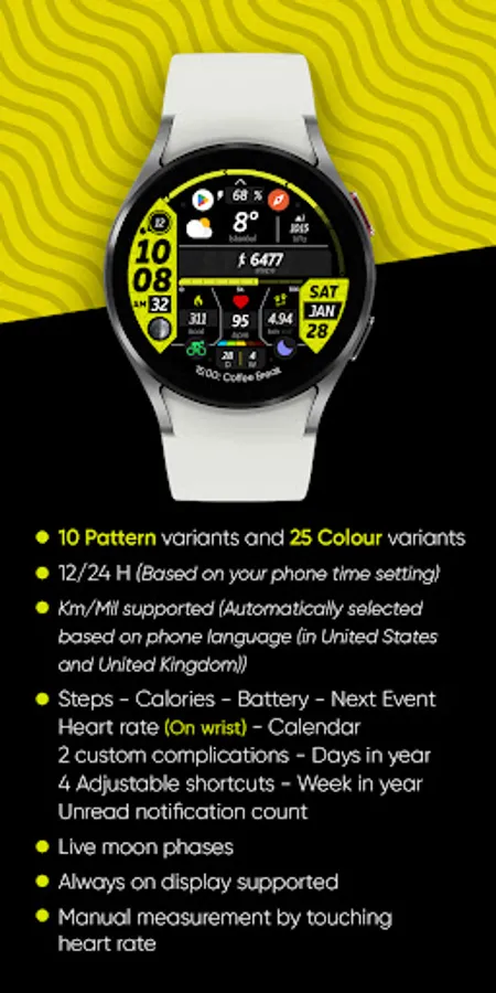 ● Steps - Calories - Battery - Next Event - Heart rate (On wrist) - Calendar - 2 custom complications - 4 Adjustable shortcuts - Days in year - Week in year - Unread notification count