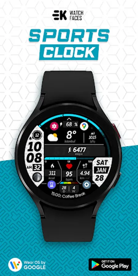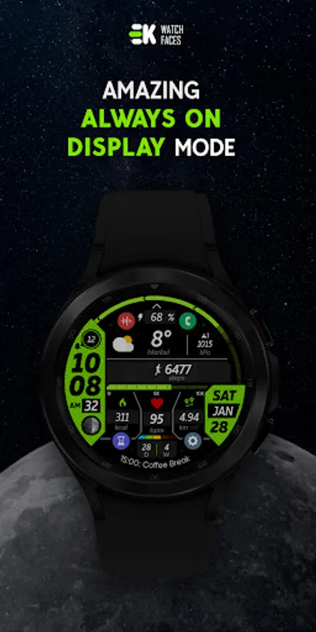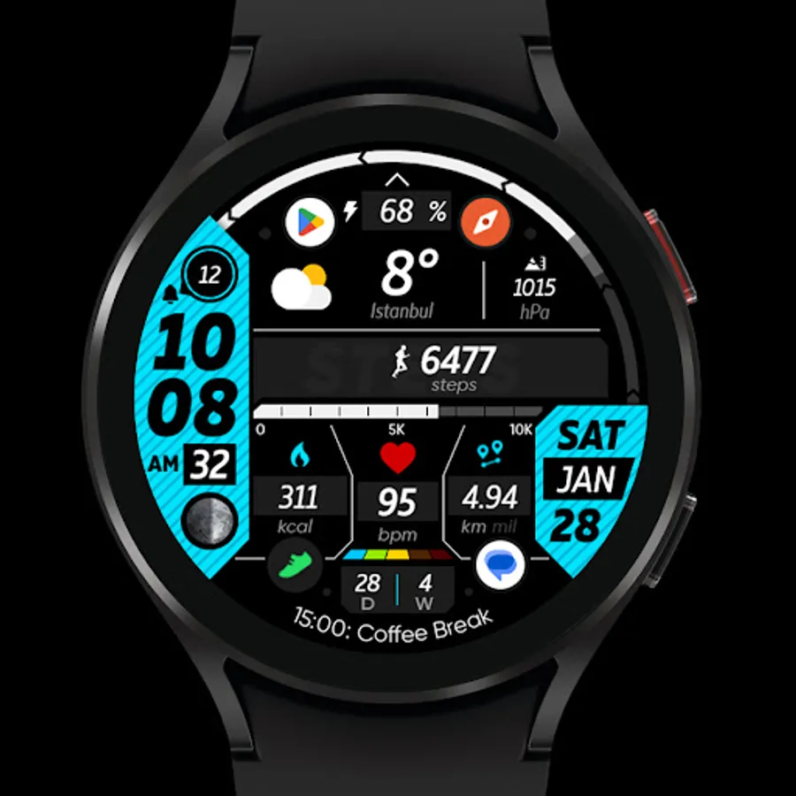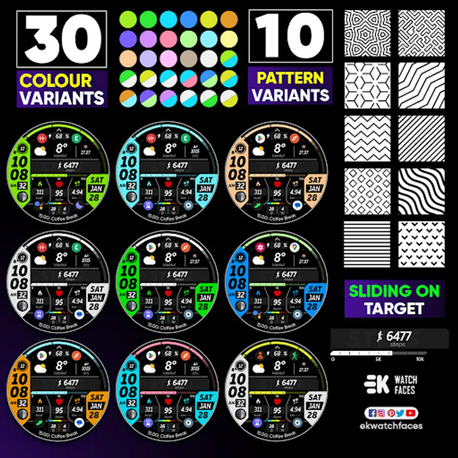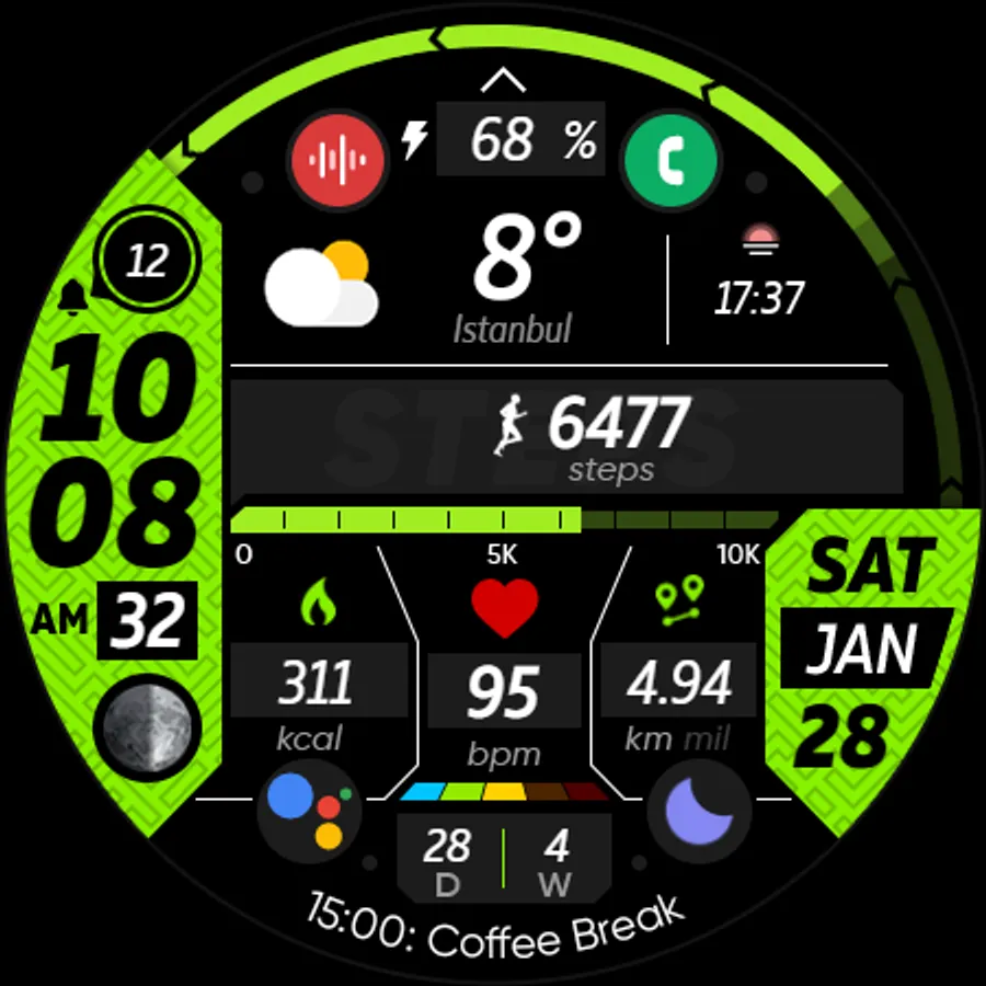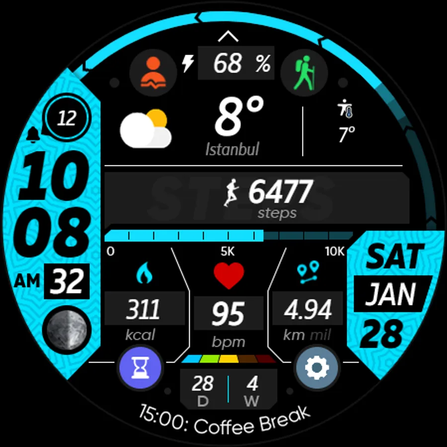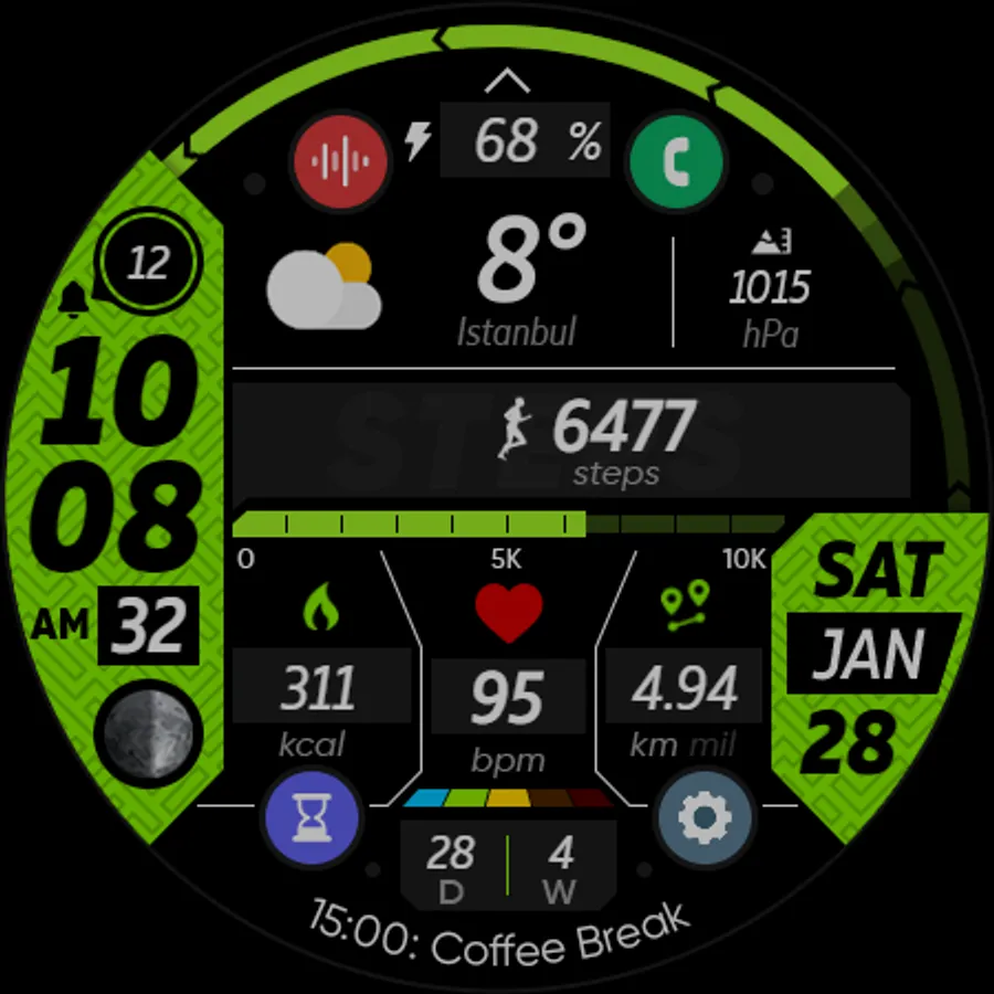 ● Steps - Calories - Battery - Next Event - Heart rate (On wrist) - Calendar - 2 custom complications - 4 Adjustable shortcuts - Days in year - Week in year - Unread notification count