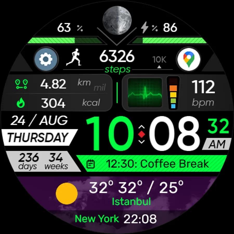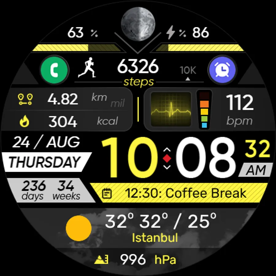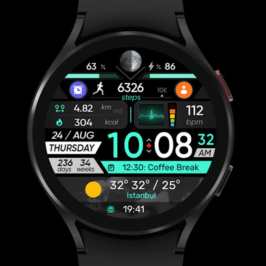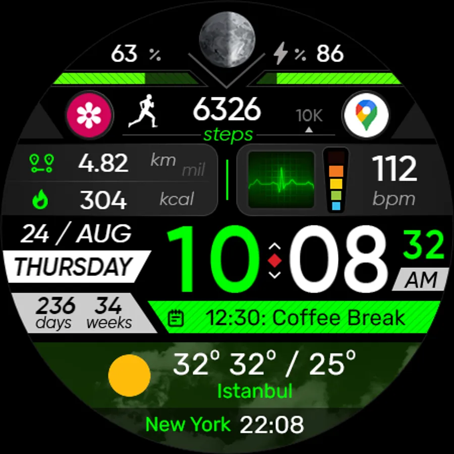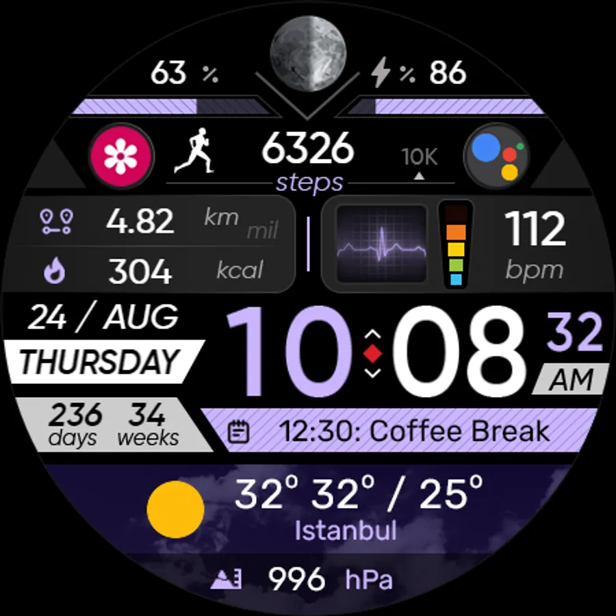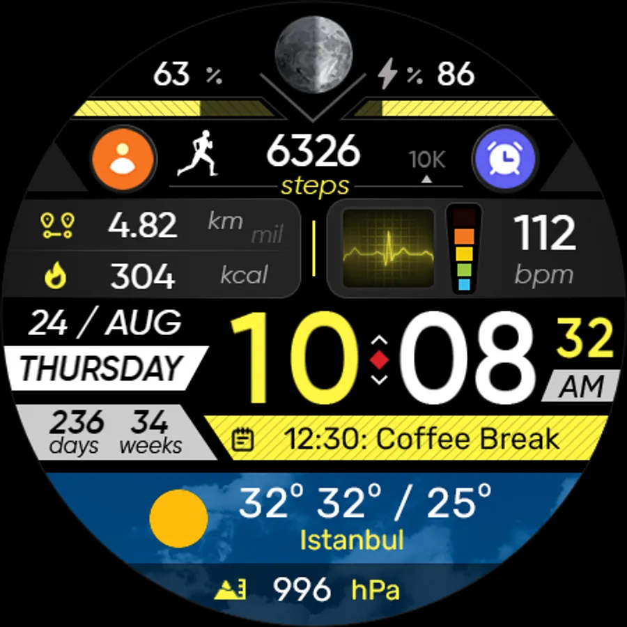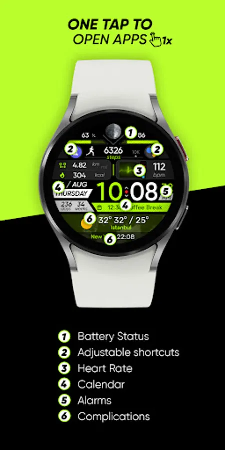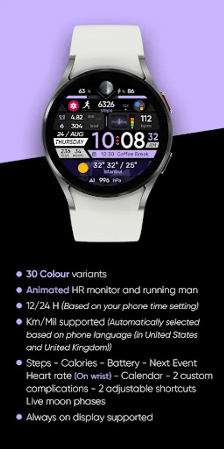 ● Steps - Calories - Battery - Next Event - Heart rate (On wrist) - Calendar - 2 custom complications - 2 adjustable shortcuts