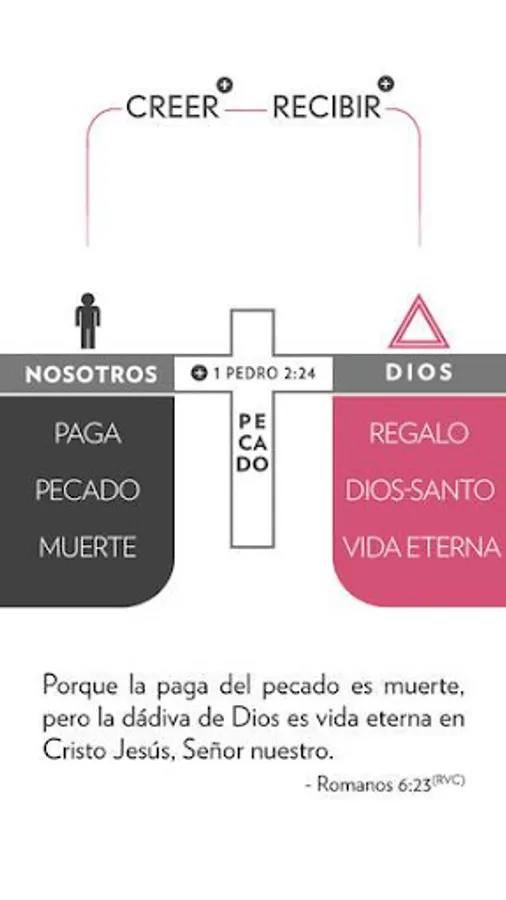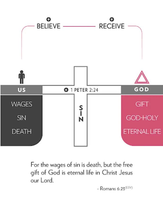 Centered on Romans 6:23, this presentation of the Gospe contrasts man's condition with God. Verses included are 1 Peter 2:24, John 6:47, John 1:12, and 1 John 5:13. At the end there is a suggested prayer to guide the person to receive Jesus Christ as personal Savior.
