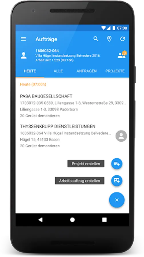 - Project registration with site address, working time and pictures (e.g. drawings, special instructions)