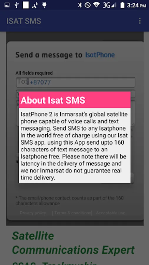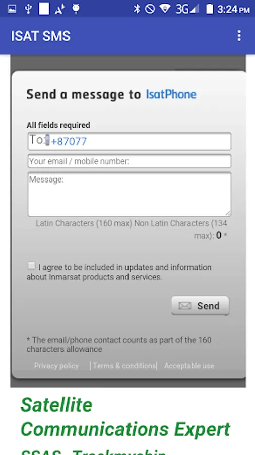 Send SMS to any Isatphone in the world free of charge using our Isat SMS app. using this App send upto 160 characters of text message to an Isatphone free. Please note there will be latency in the delivery of message and we nor Inmarsat do not guarantee real time delivery.