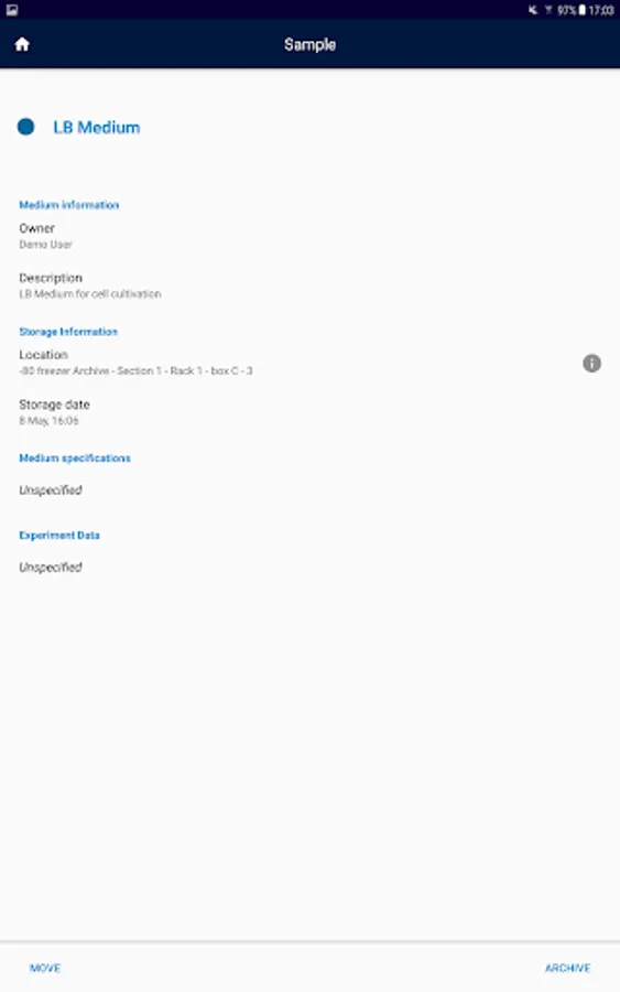 • Scan printed 2D barcodes of samples and sample series to view information and to move or archive items