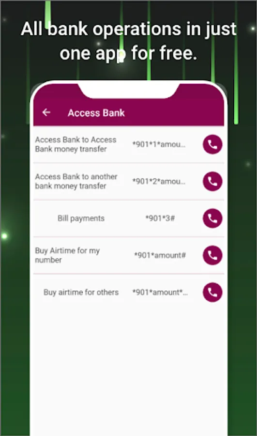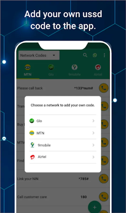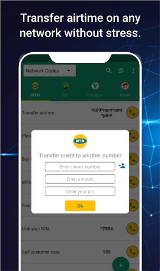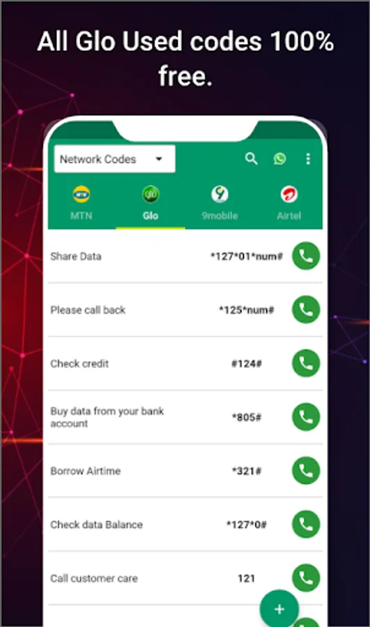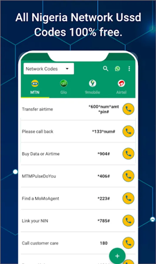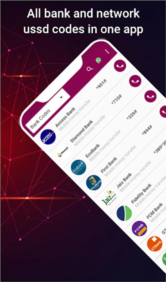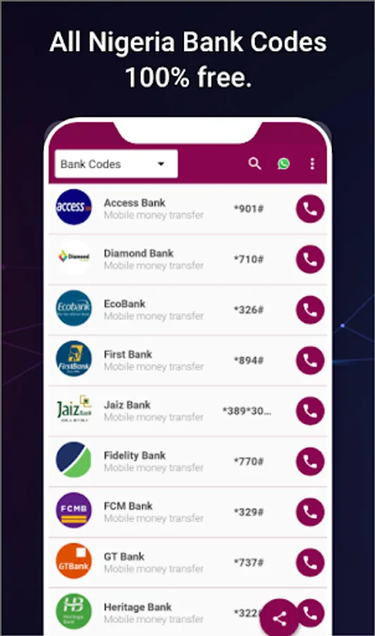 Nigeria Ussd & Bank Codes is a mobile application that provides you with all network and Banking USSD codes in Nigeria. The application has a collection of all network and banking USSD codes that are supported for all banking services in Nigeria. With Nigeria Ussd & Bank Codes, you are able to do a bank to bank transaction or account to account money transfer within the same bank. This USSD codes app also provide you with codes that can enable you to buy airtime, pay bills and other transactions directly from your bank account.