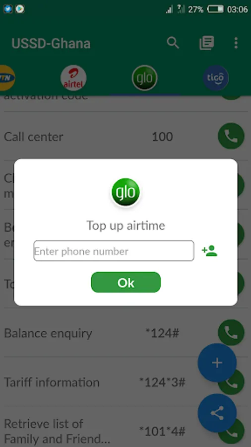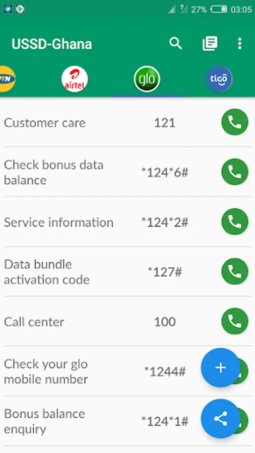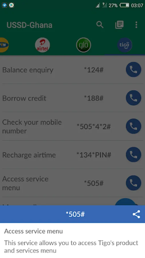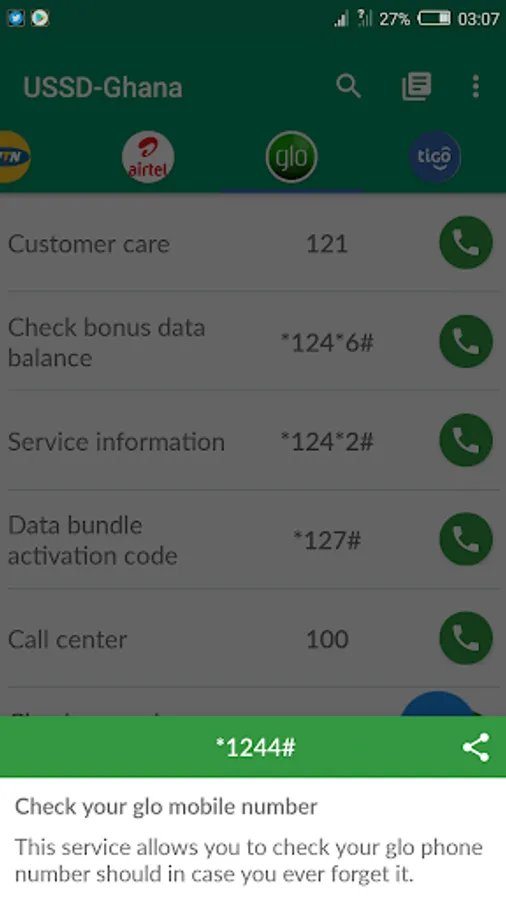 USSD-Ghana is a mobile application that provides an intuitive human-machine interface to subscribers of all telephone networks in Ghana. It allows access to all USSD services available on a particular network without requiring any special memory effort from the users.With USSD-Ghana, a user is able request a Callback from another contact with respect to the given network by just clicking on a button and picking the contact from his phone book.The application also allows for user to add their own USSD codes to the list and can choose either to dial, edit or delete this code later.To used this application on devices running android 6.0 and above, first make sure you turn on permissions for the application(permission to access contact and dial your phone) in your device settings.To access any service from any network, click on the call button that correspond to the service you wish to access.
