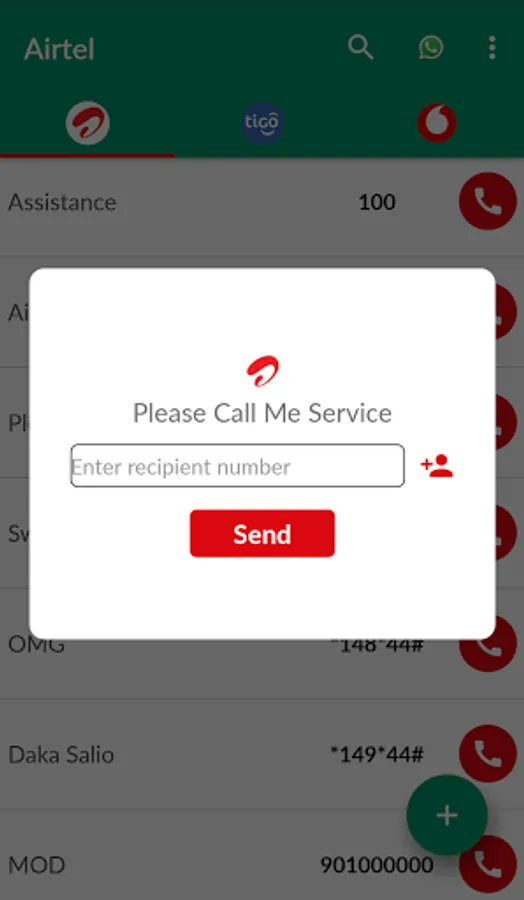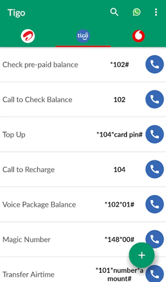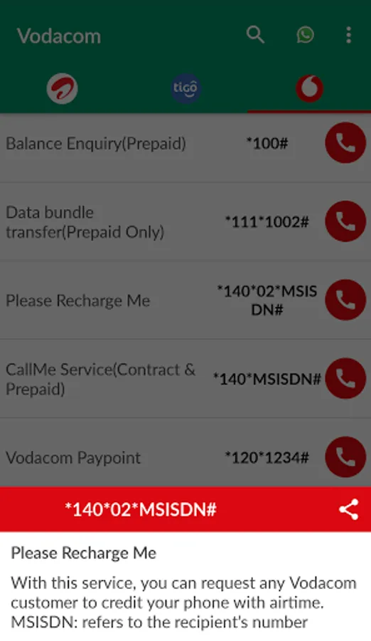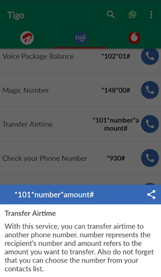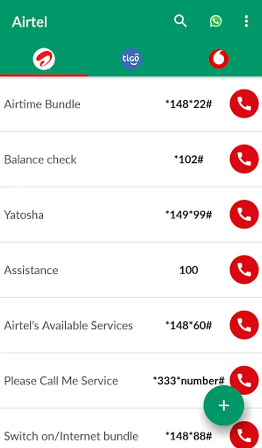 Each tab contains a list of all the shortcodes with an explanation of each code and a dial button that dials the corresponding USSD code. For instance, on the Airtel tab, you can find codes that will help you do the following: