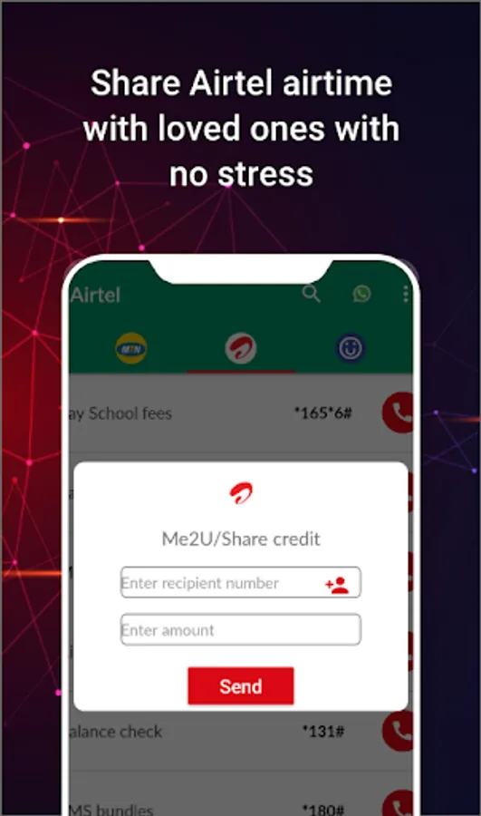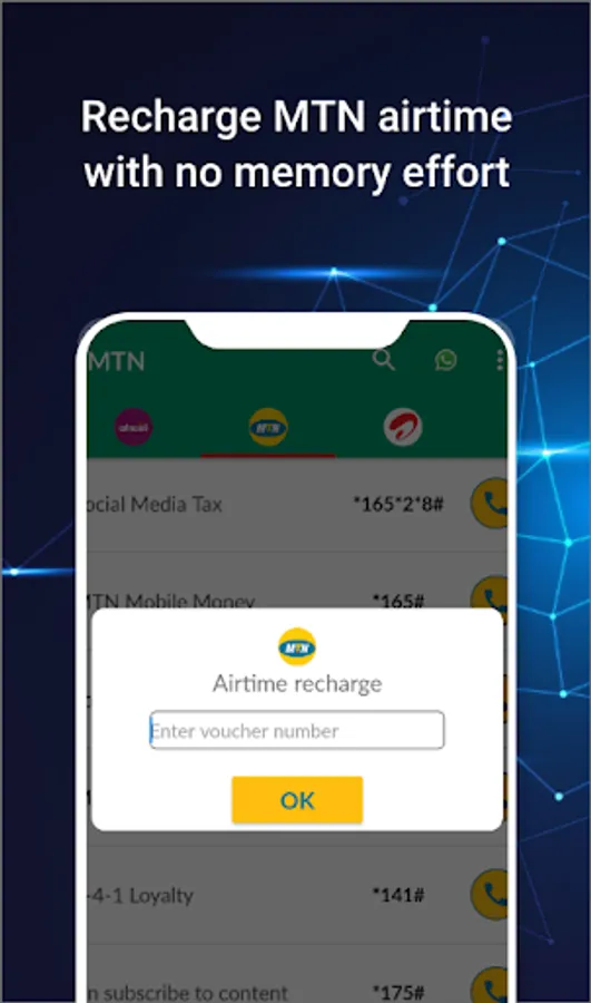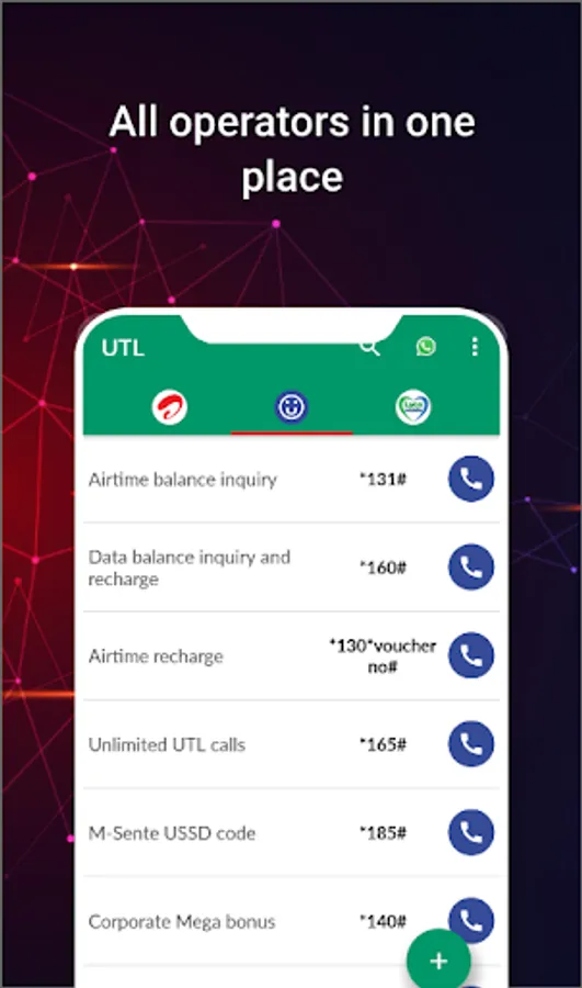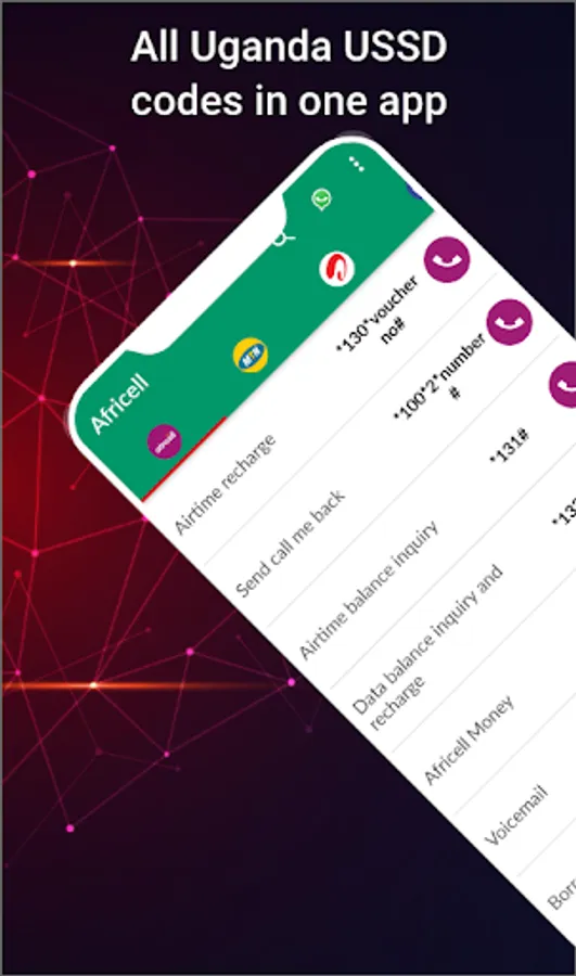 USSD Uganda is a mobile application that will help you to easily dial a USSD code from any network operator in Uganda(Africell, MTN, Airtel, UTL, Lycamobile, and Smart Telecom). USSD Uganda is designed in 6 tabs, each representing the various network operators in Uganda(Africell, MTN, Airtel, UTL, Lycamobile, and Smart Telecom).