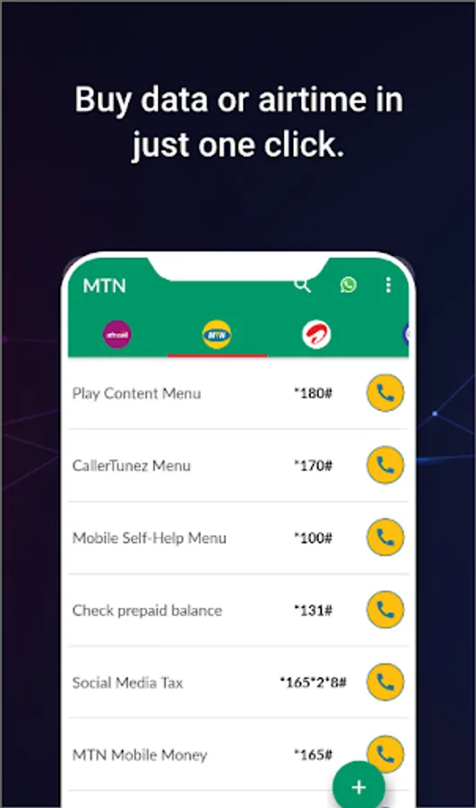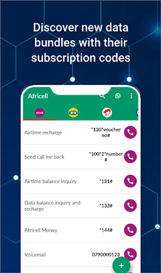 Each tab contains a list of all the shortcodes with an explanation of each code and a dial button that dials the corresponding USSD code. For instance, on the Africell tab, you can find codes that will help you do the following: