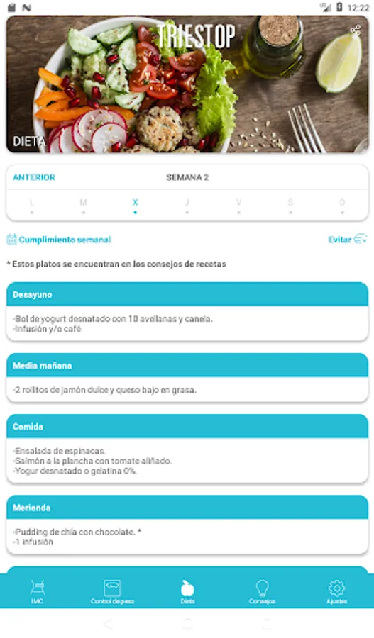 • Daily and weekly diet planner designed by nutritionists. With the option of sending the weekly diet to the personal mail.