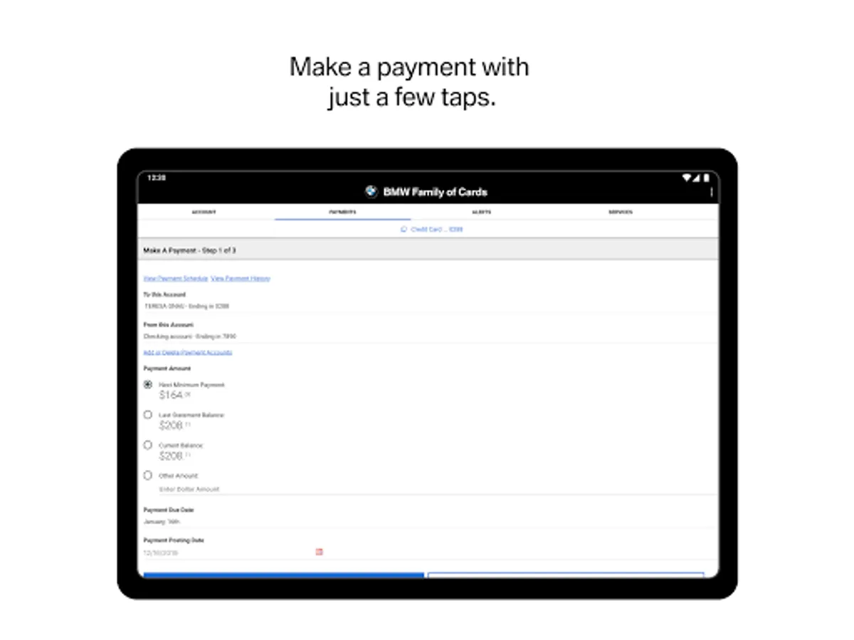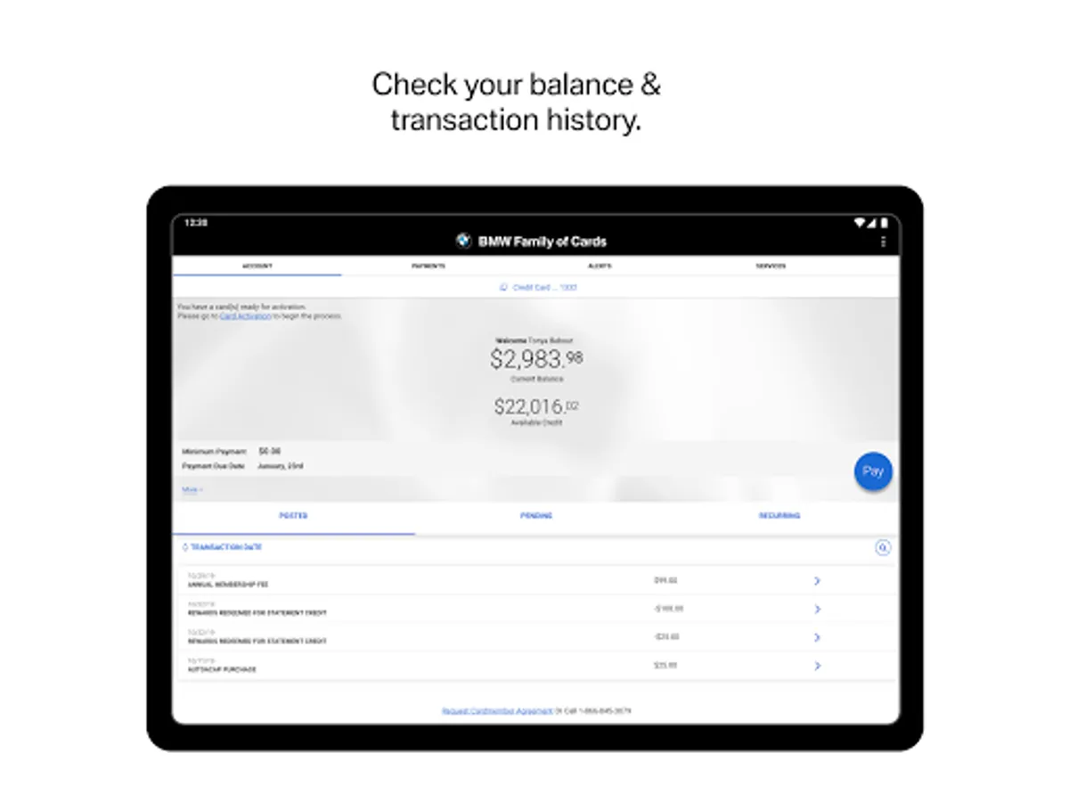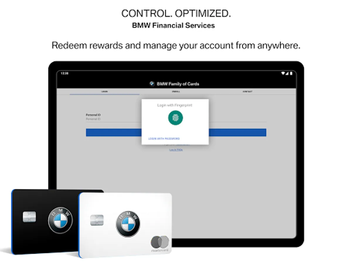 You can manage your BMW credit card conveniently and securely from anywhere, using the BMW Family of Cards Mobile App. Check your account balance, view account info, make payments, redeem rewards, and more!