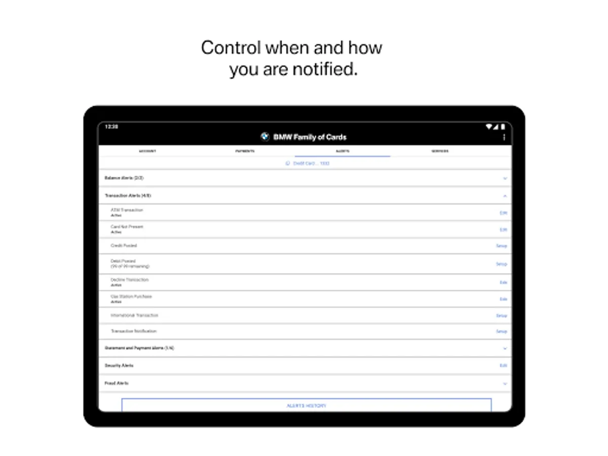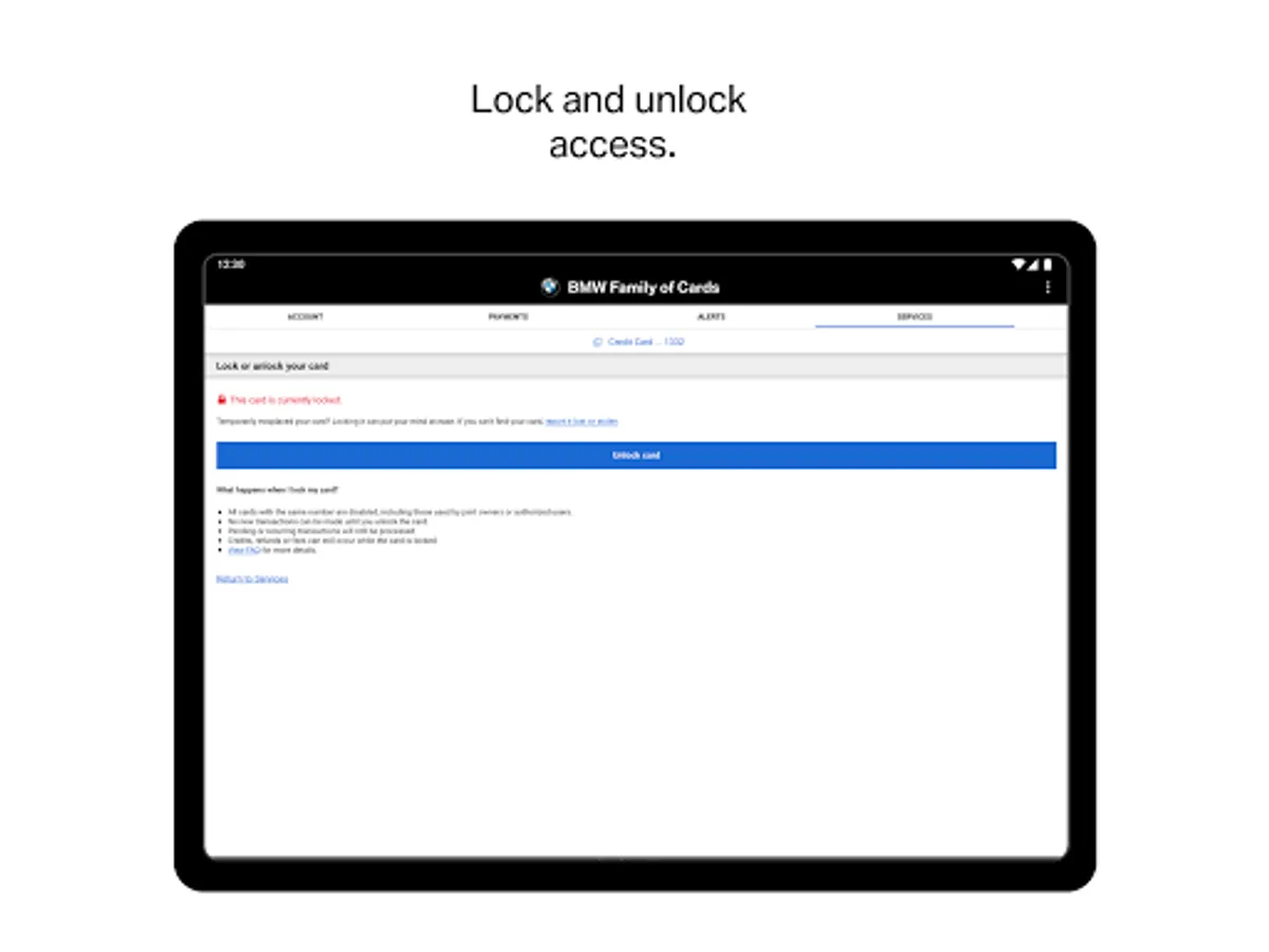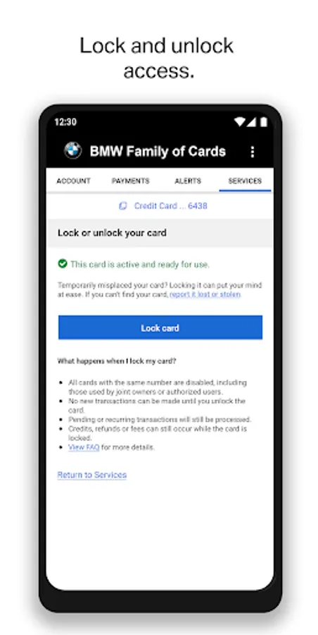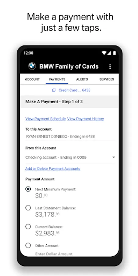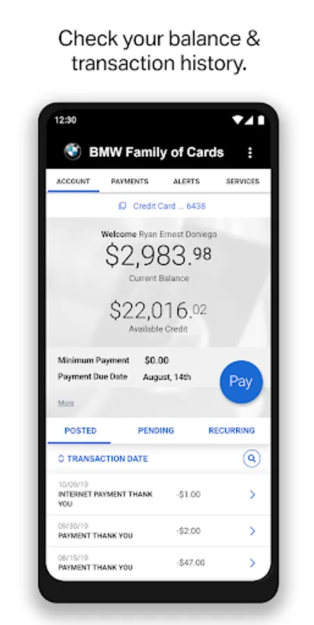 You can manage your BMW credit card conveniently and securely from anywhere, using the BMW Family of Cards Mobile App. Check your account balance, view account info, make payments, redeem rewards, and more!