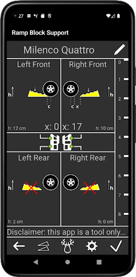 The app shows the amount of centimeters or inches each wheel has to rise, taking the wheelbase and the wheel width into account (values for wheelbase and wheel width can be set according to your vehicle's specifications). The app can also show how to position your leveler blocks for best result!