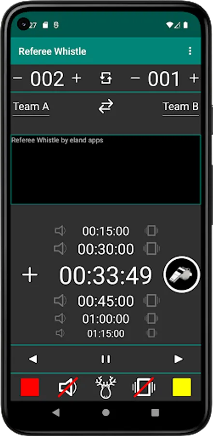 The app includes a Stopwatch (up and down), the possibility to keep Notes and Score, and includes Red and Yellow card.