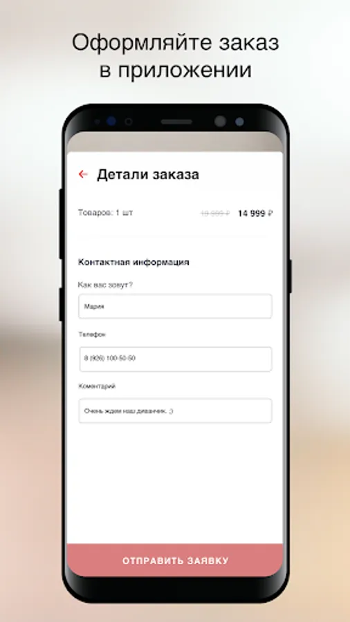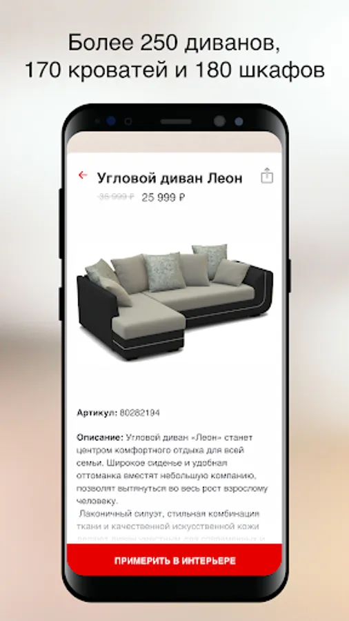 Assess how the selected furniture looks in your interior. Learn the features of materials and textures - they are as close as possible to the original. Are you satisfied? Order your favorite piece of furniture right away - without leaving the app. And you can also share a link to it with your friends - via instant messengers or via email.