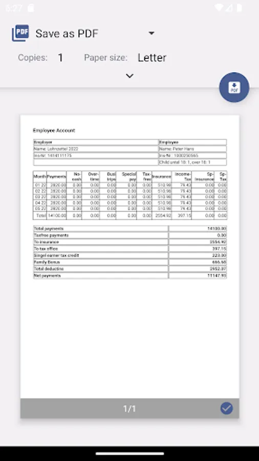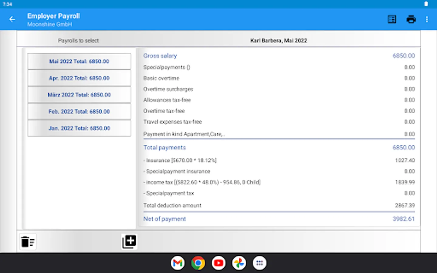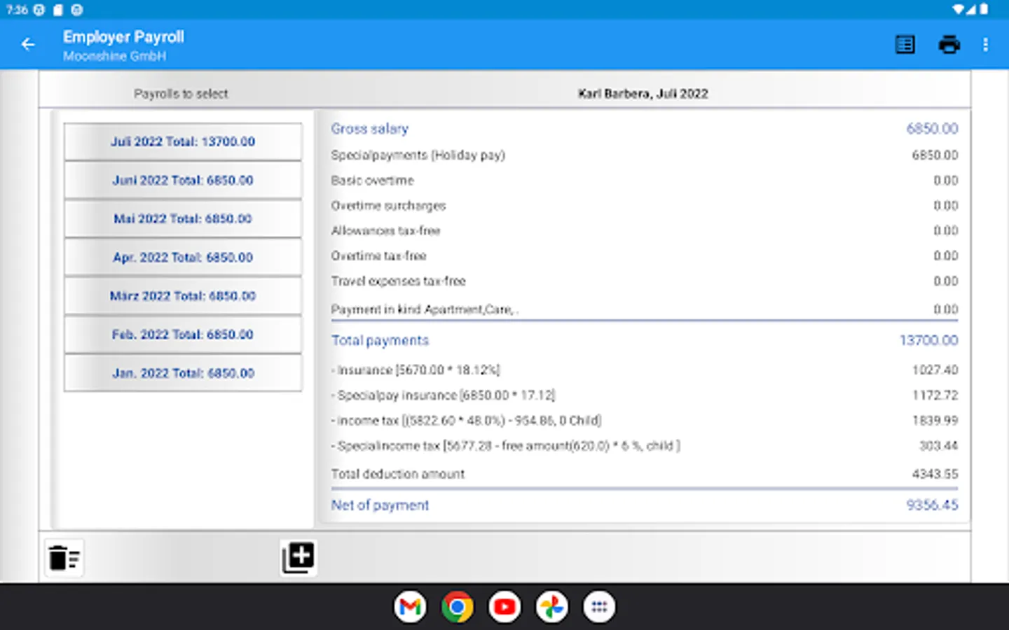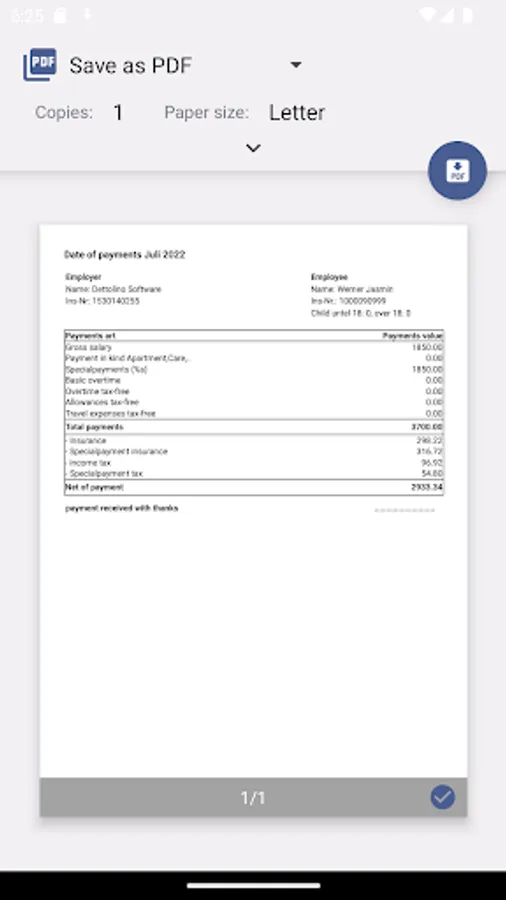 First select employees, then all payslips are visible in the selection list, which shows the payroll content on the display with a click, the printer and payroll account printer are in the menu for selection.