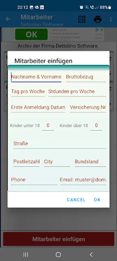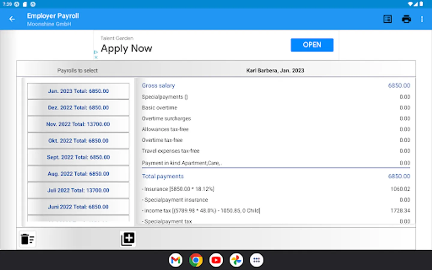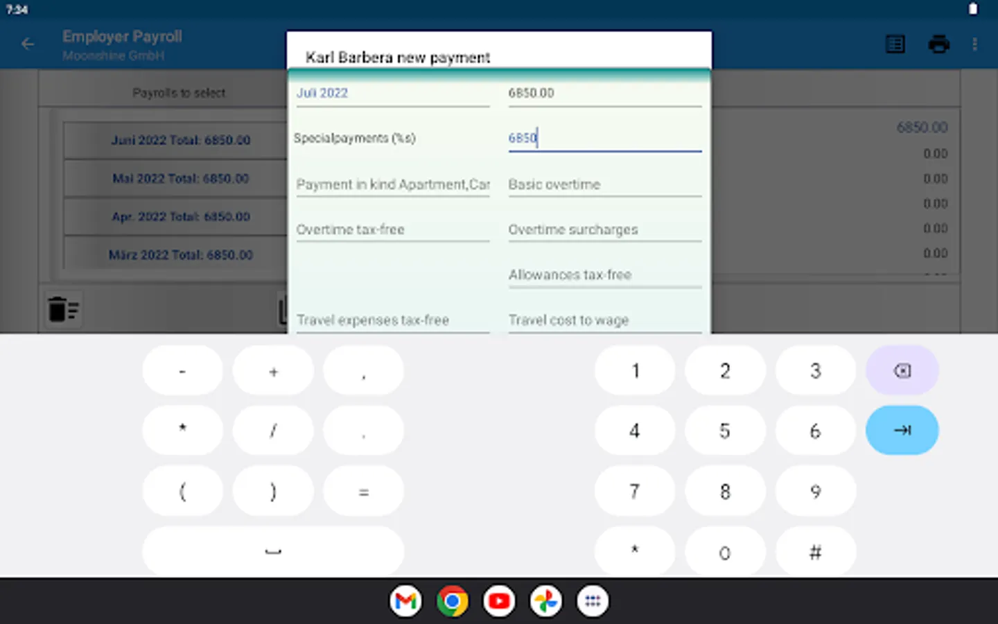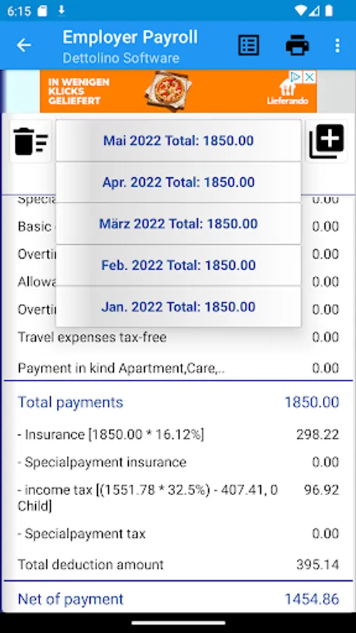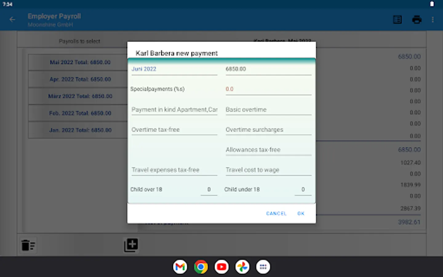 There you get employee data form, it includes all possible payment types such as the special payment, types of benefits in kind, overtime, allowances and travel expenses. monthly debit date is created automatically, the monthly payment reference and the number of children have been taken from the employee data and can be updated every month, press OK, the data is inserted in the payslip folder and viewed on the display. When registering during the year or during the billing period, the calculation is calculated for the first payment and the special payments.