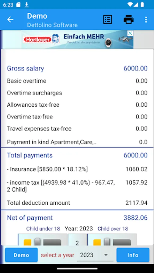 Since you have two control buttons for children under 18 and children over 18 years of age when you press them you can see the bonus deduction for income tax and the change in net payment.