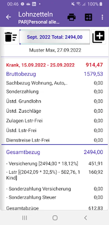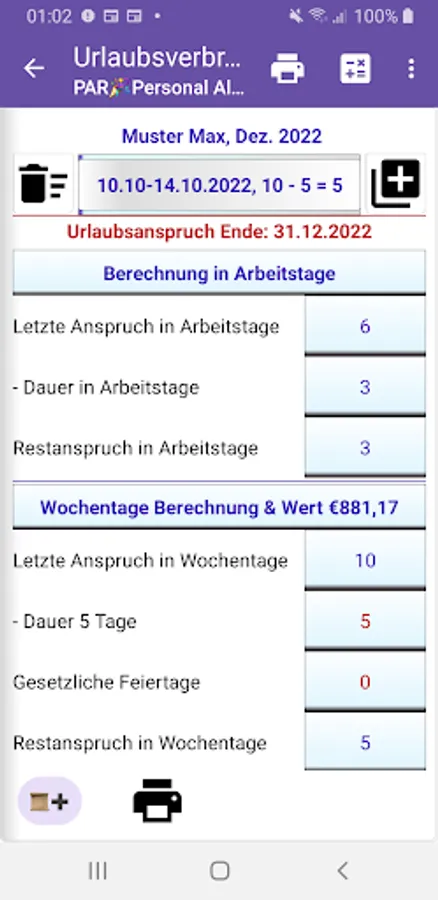 6. The data recorded in the sick leave calculator are after determining the calculation type in the personnel archive, years of service and remaining entitlements are automatically calculated as far as a hindrance period is inserted, the data appear in the accounting period, even if they have been entered retrospectively or retrospectively. With the continued payment of entitlement consumption, the roll-up is carried out automatically.