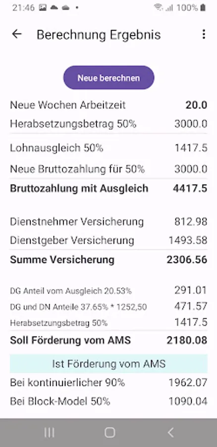 You enter requested data and immediately you have the calculation for reduced working hours, wage compensation even with the maximum assessment basis, payment of remuneration, social security contributions, support money from the AMS and replacement payment from the AMS