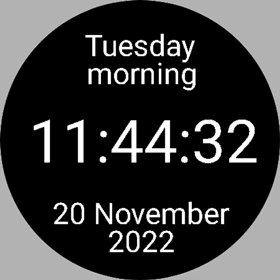 This is a simple Wear OS watch face with many power saving features, high contrast and clear display of numeric and named times, dates and days of the week that can help guide someone living with dementia or not to what time it is.