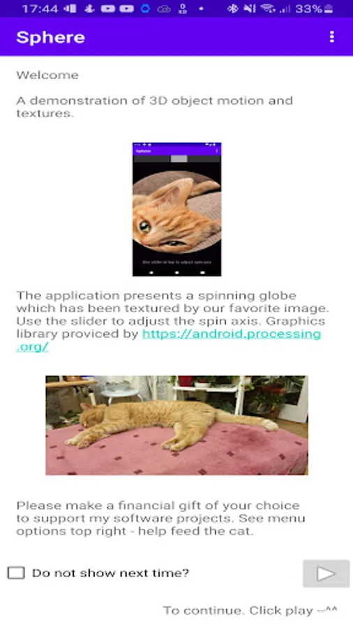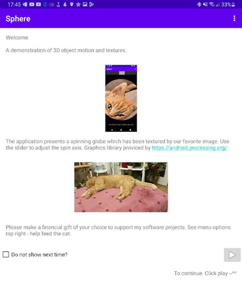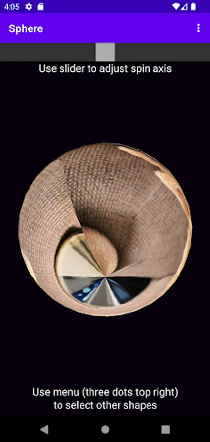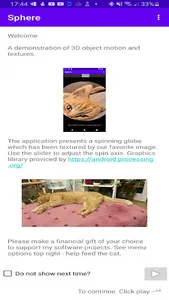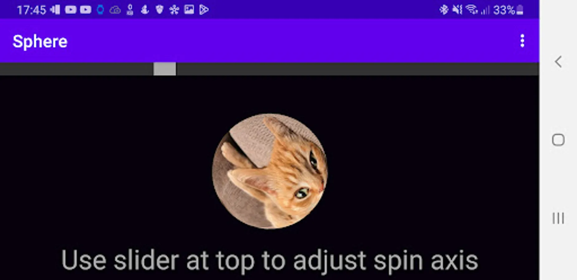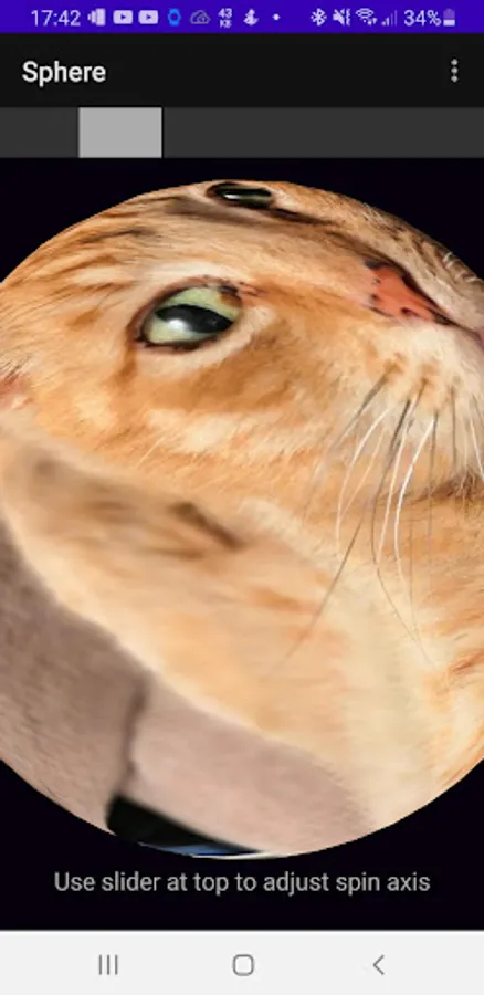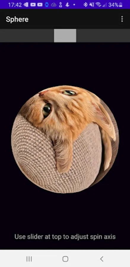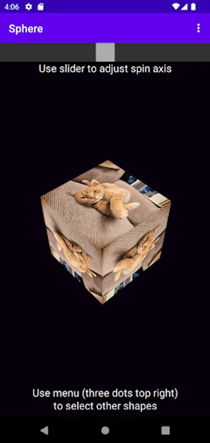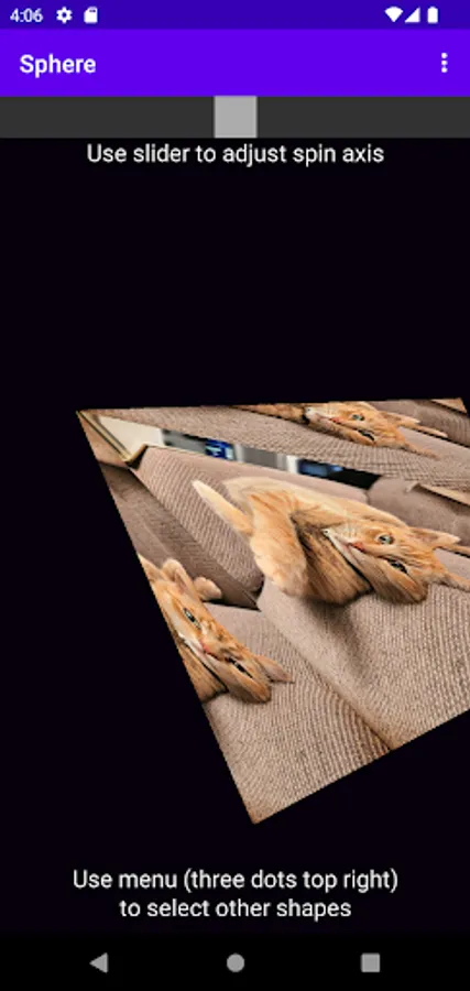 The application presents a spinning globe which has been textured by the cat. Use the slider to adjust the spin axis. Menu (three dots top right) to select other shapes. One finger touch and drag the object to a new place. Pinch two fingers to resize the object as needed.