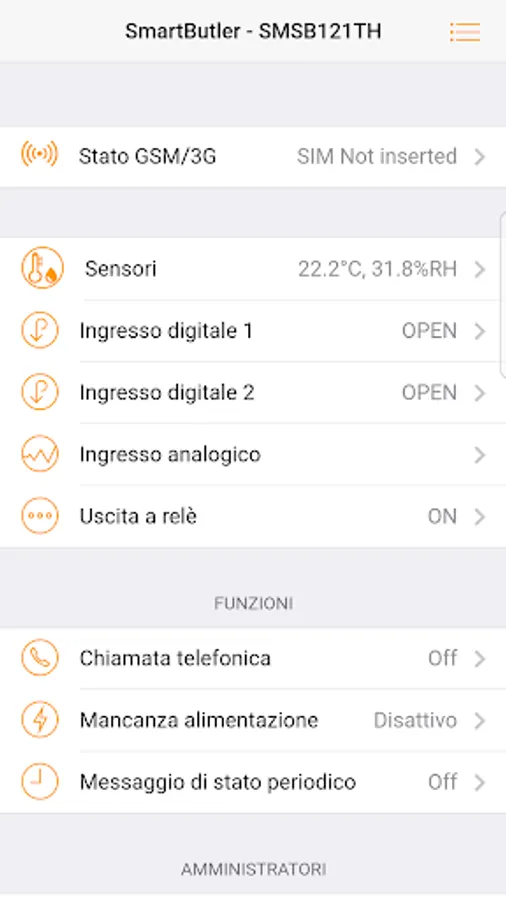 The 3G/UMTS remote control is suitable for remote activation of electrical or electro-hydraulic equipment such as prepared chronothermostats, boilers, burners, zone valves, pumps, irrigation systems, civil systems, air conditioning/heating systems, control of pumps and irrigation systems, electric gates, etc..... Thanks to its internal sensors, smartButler can regulate the room temperature and monitor the relative humidity of a room remotely via SMS.